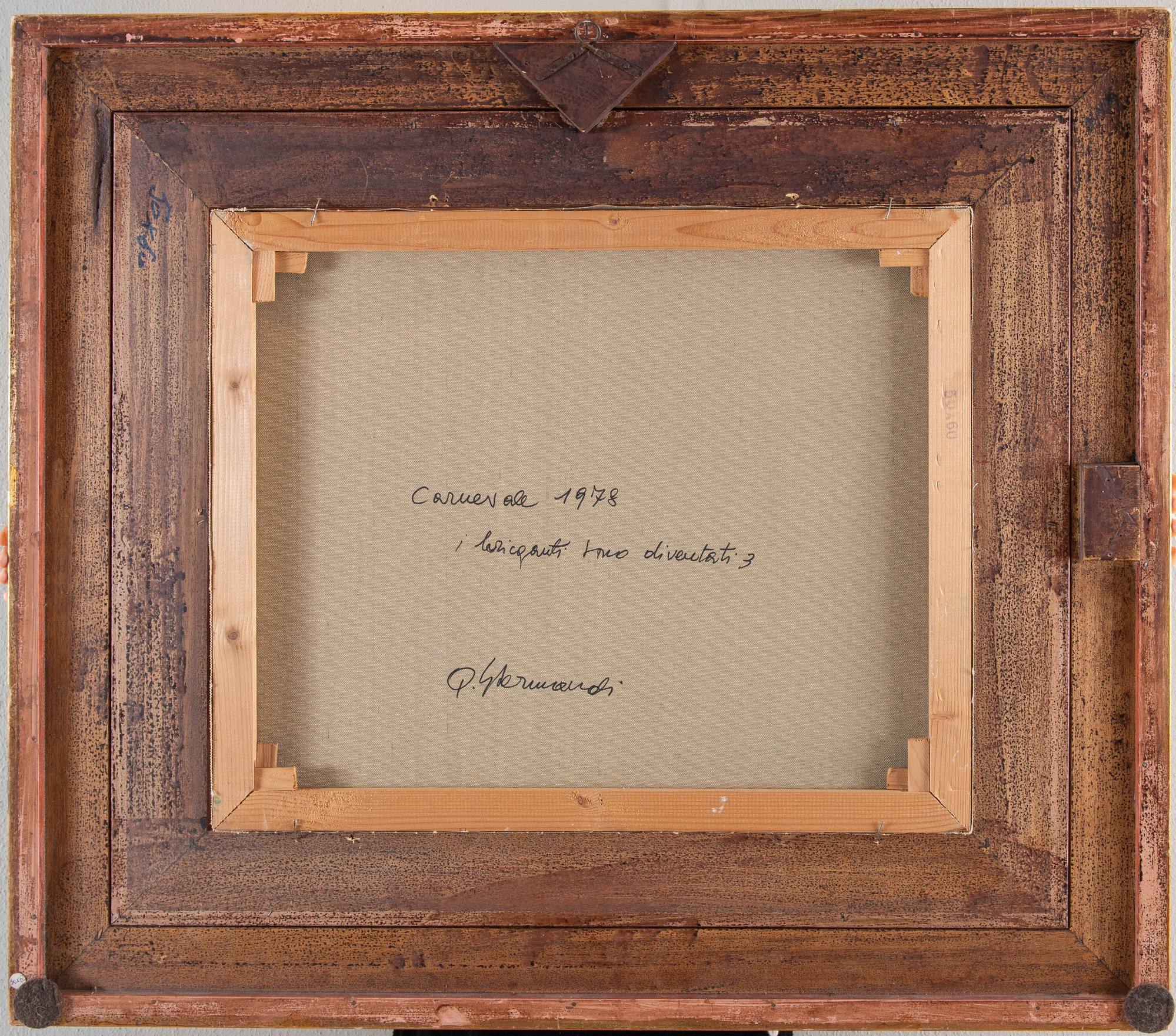 QUINTO GHERMANDI (Crevalcore 1916 – San Lazzaro di Savena 1994) “Carnevale 1978, I briganti sono diventati tre”. Olio su tela. Cm 50x60. Opera firmata in basso a sinistra Q. Ghermandi. Al retro opera intitolata, datata e firmata Carnevale 1978, I briganti sono diventati tre Q. Ghermandi.