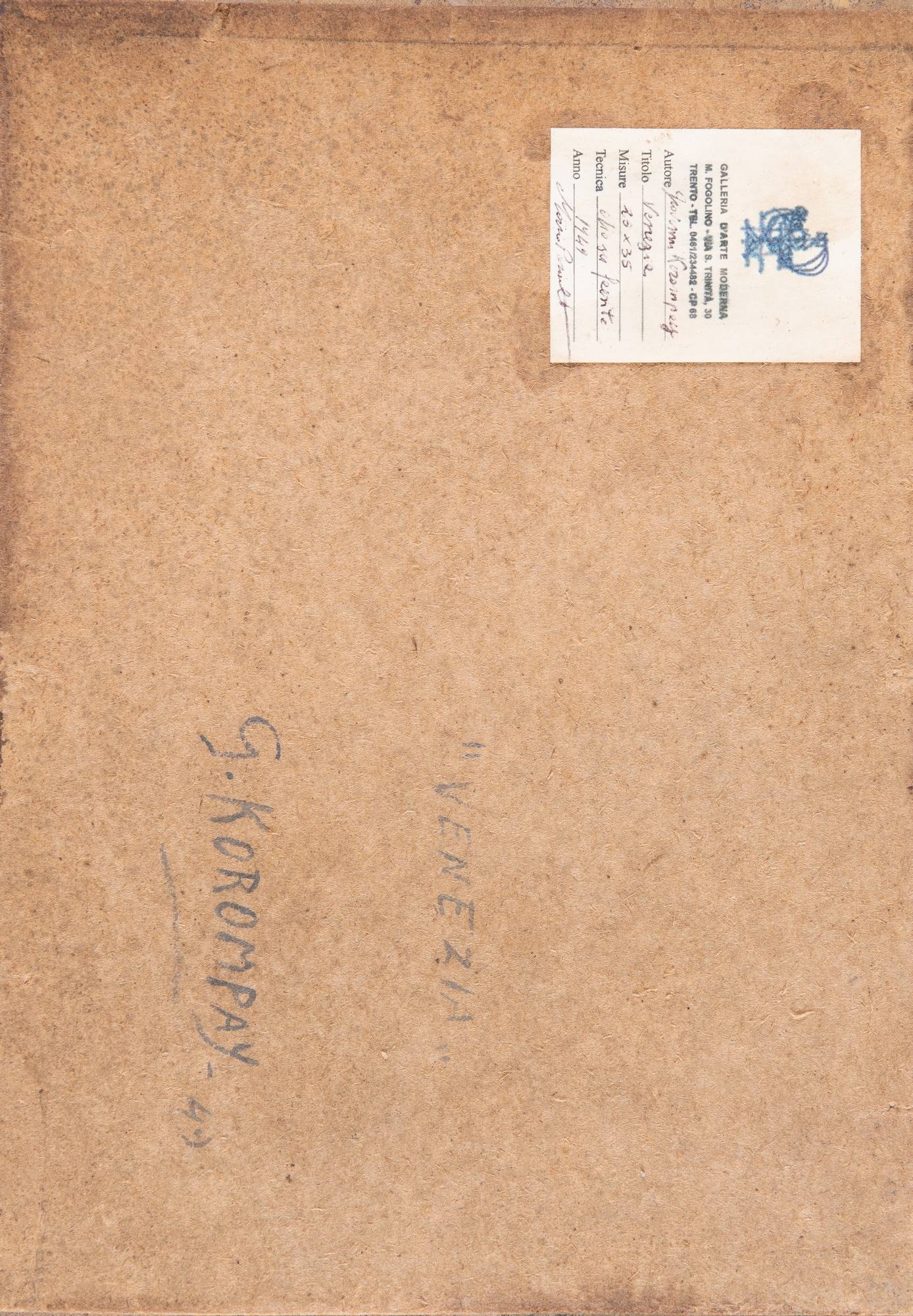 GIOVANNI KOROMPAY (Venezia 1904 – Rovereto 1988) “Venezia”, 1949. Olio su faesite. Cm 25x35. Opera firmata e datata in basso a destra G.Korompay 49. Al retro opera intitolata, firmata e datata “Venezia” “G.Korompay-49. Al retro reca etichetta Galleria d’Arte Moderna M. Fagolino (Trento). Opera accompagnata da autentica su fotografia a firma Guido Perocco.