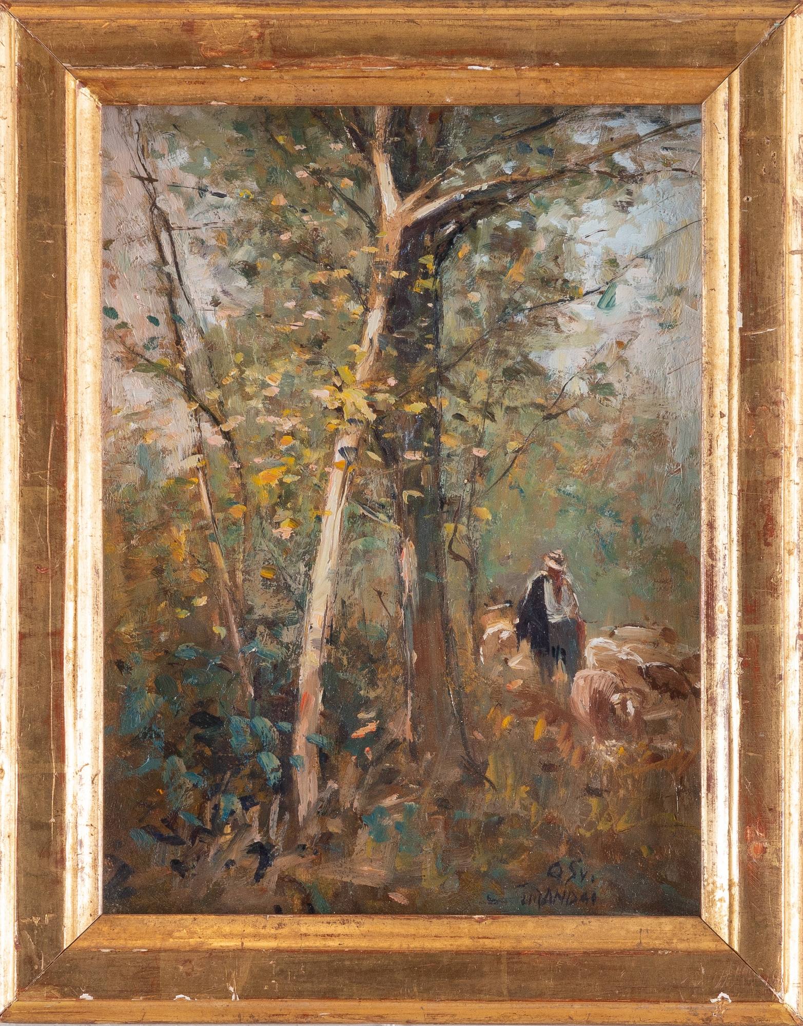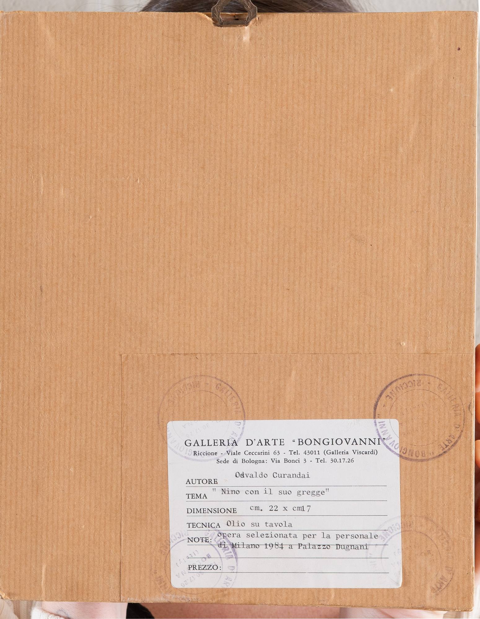 OSVALDO CURANDAI (Firenze 1931 - 2019) “Nino con il suo gregge”. Olio su tavola. Cm 22x17. Opera firmata in basso a destra Osv. Curandai. Al retro reca etichetta con timbri Galleria d’Arte Bongiovanni (Riccione - sede di Bologna) in quanto opera selezionata in occasione della mostra personale di Milano del 1984 a Palazzo Dugnani.