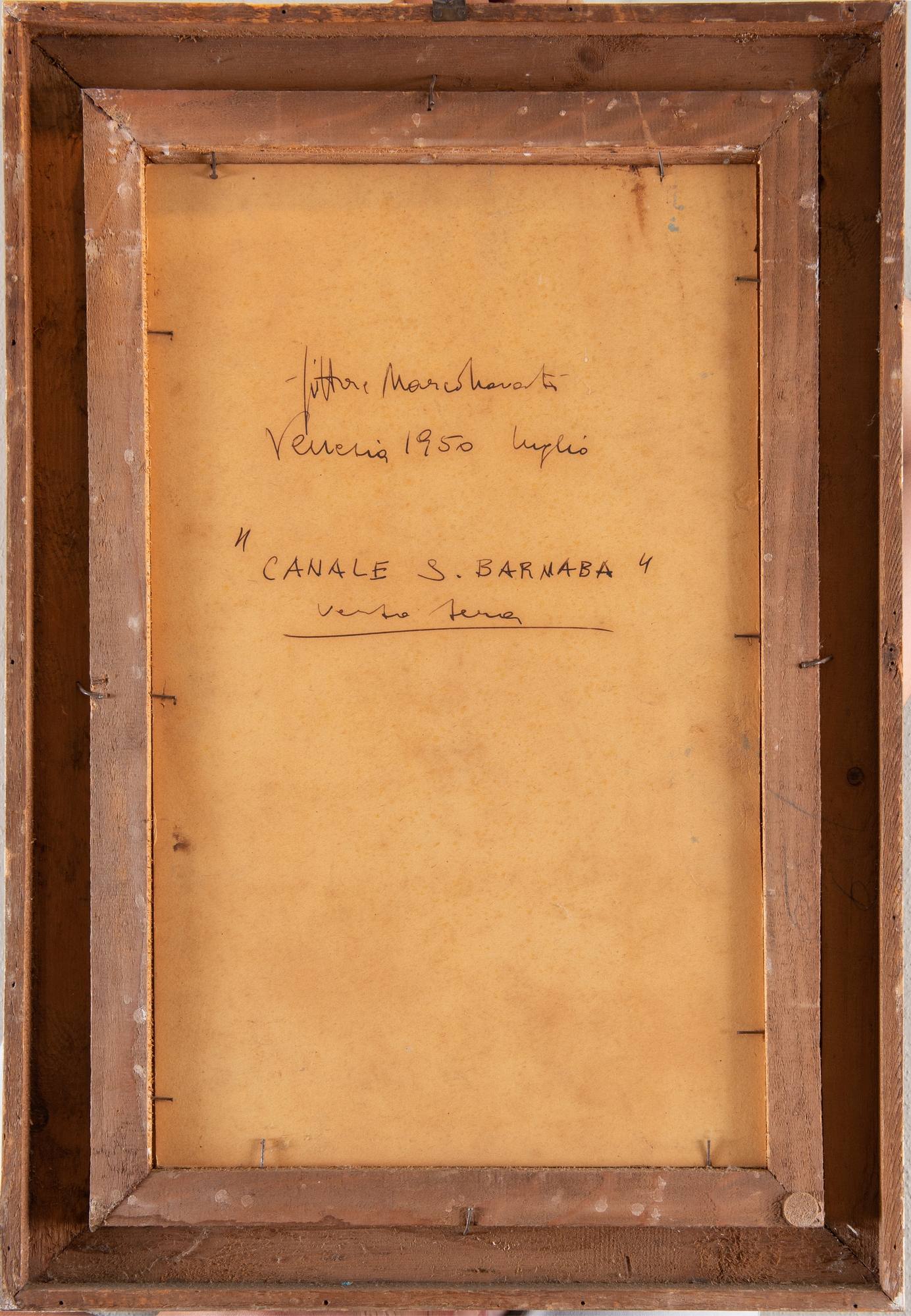 MARCO NOVATI (Venezia 1895 – 1975) “Canale S. Barnaba”, 1950. Olio su cartone. Cm 49x30. Opera firmata in basso a destra Marco Novati. Al retro opera firmata, intitolata e datata Marco Novati Venezia 1950 Luglio Canale S. Barnaba.
