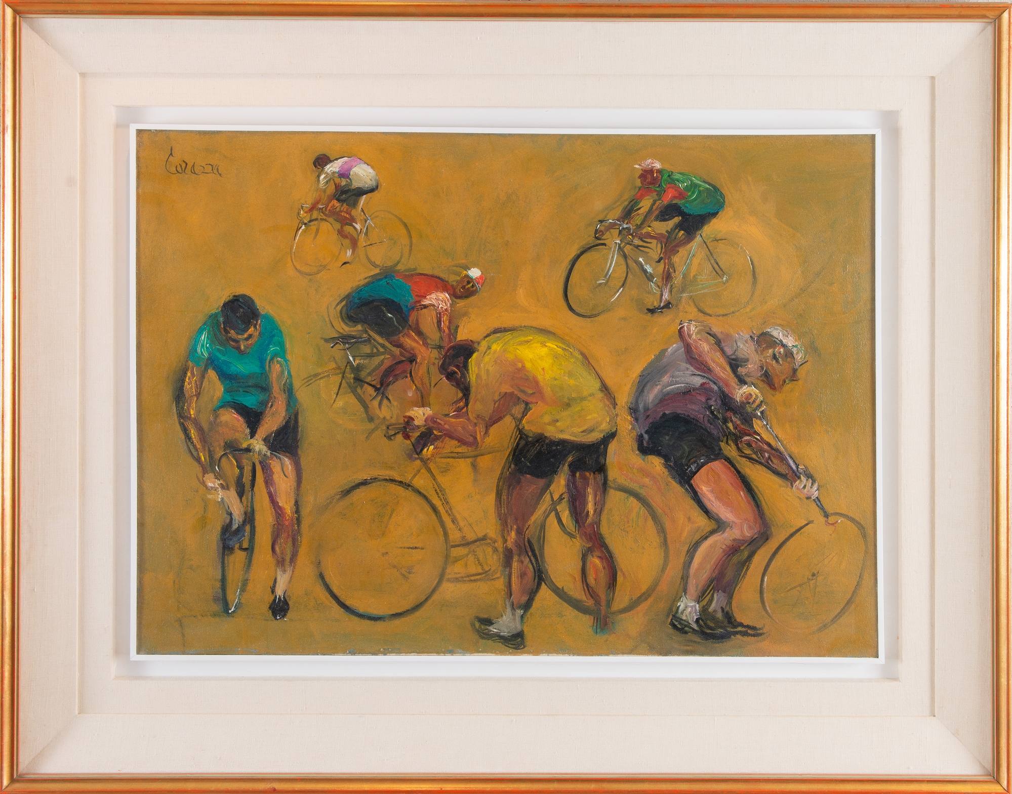 CORRADO CORAZZA (Bologna 1897 - 1975) “Ciclisti”. Olio su tela. Cm 50x70. Opera firmata in alto a sinistra Corazza.