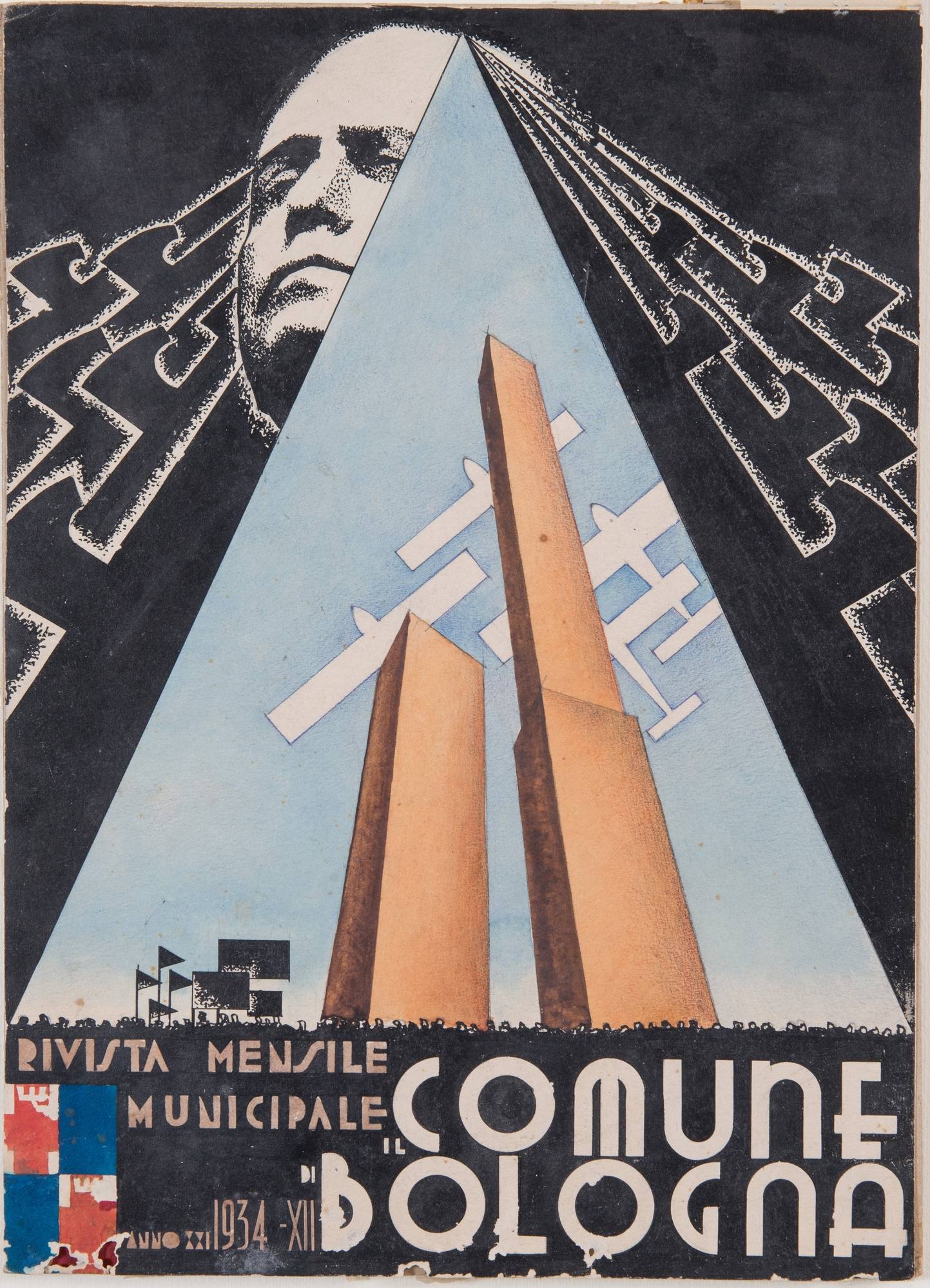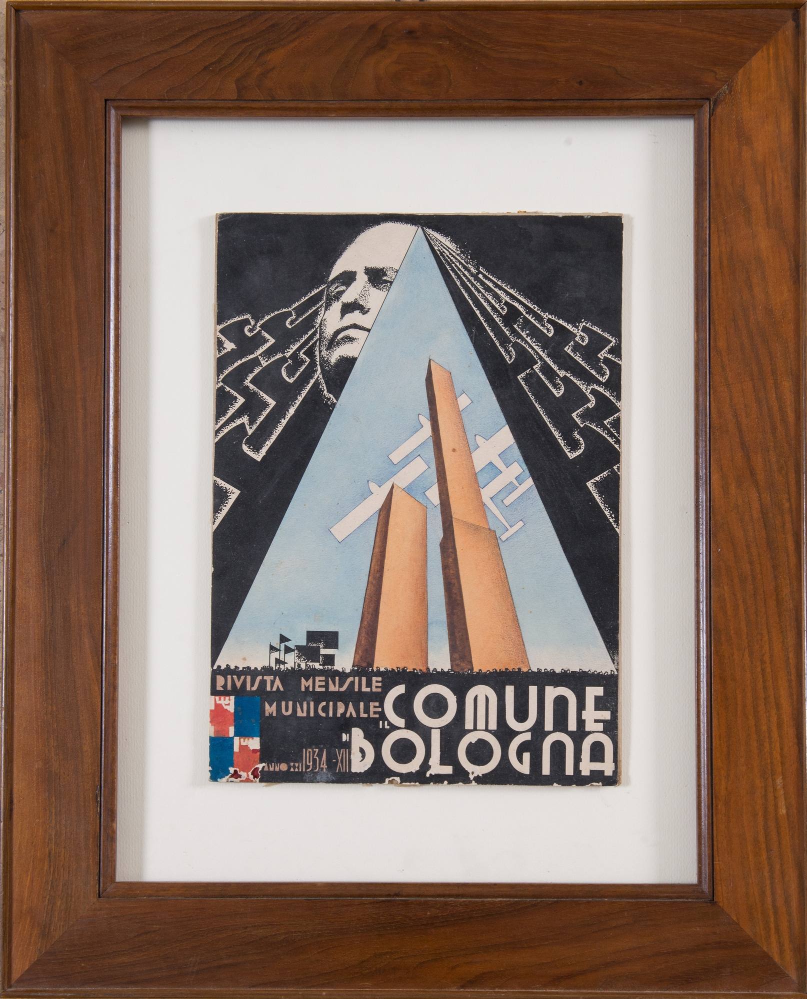 SANDRO DELLA ROVERE e CAVAZZA LUCIANO (XX sec.) “Motto: oggi e domani”, 1934. Tecnica mista su cartone. Cm 37x24,5. Bozzetto originale partecipante al concorso annuale per la copertina de “Il comune di Bologna”, rivista mensile fascista uscita dal 1924 al 1939. Quest’opera ha vinto un premio speciale di riconoscimento per il concorso del 1934. Bibliografia: opera pubblicata in “Il Comune di Bologna”, gennaio 1934, pag. 77.