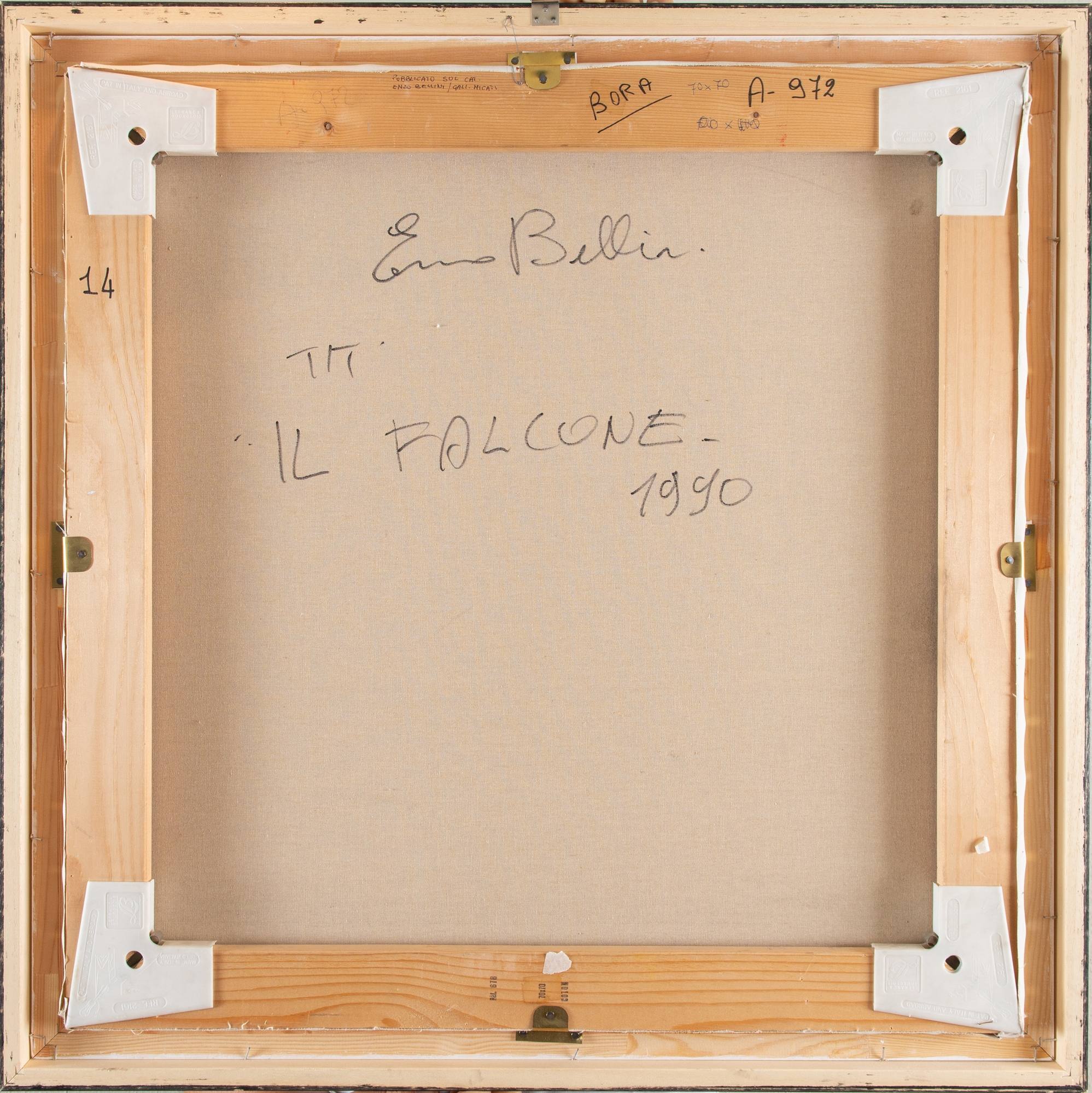 ENZO BELLINI (Santa Sofia 1932 – 2015) “Il falcone”, 1990. Olio su tela. Cm 70x70. Opera firmata e datata in basso a destra Bellini 90. Al retro opera firmata, intitolata e datata Enzo Bellini Il falcone 1990. Bibliografia: opera pubblicata nel catalogo Enzo Bellini, Galleria Micati (Alcamo). Opera accompagnata dal certificato di garanzia e autenticità della Meeting Art.