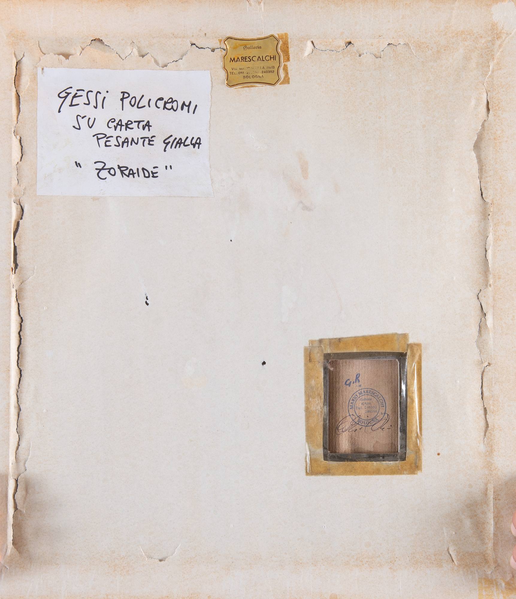 GIOVANNI ROMAGNOLI (Faenza 1893 – Bologna 1976) “Zoraide”. Tecnica mista su carta. Cm 26x23. Opera siglata in alto a sinistra G. R. Al retro reca timbro della Galleria d’arte Mario Marescalchi con firma Mario Marescalchi. Al retro reca etichetta della Galleria d’Arte Mario Marescalchi (Bologna).