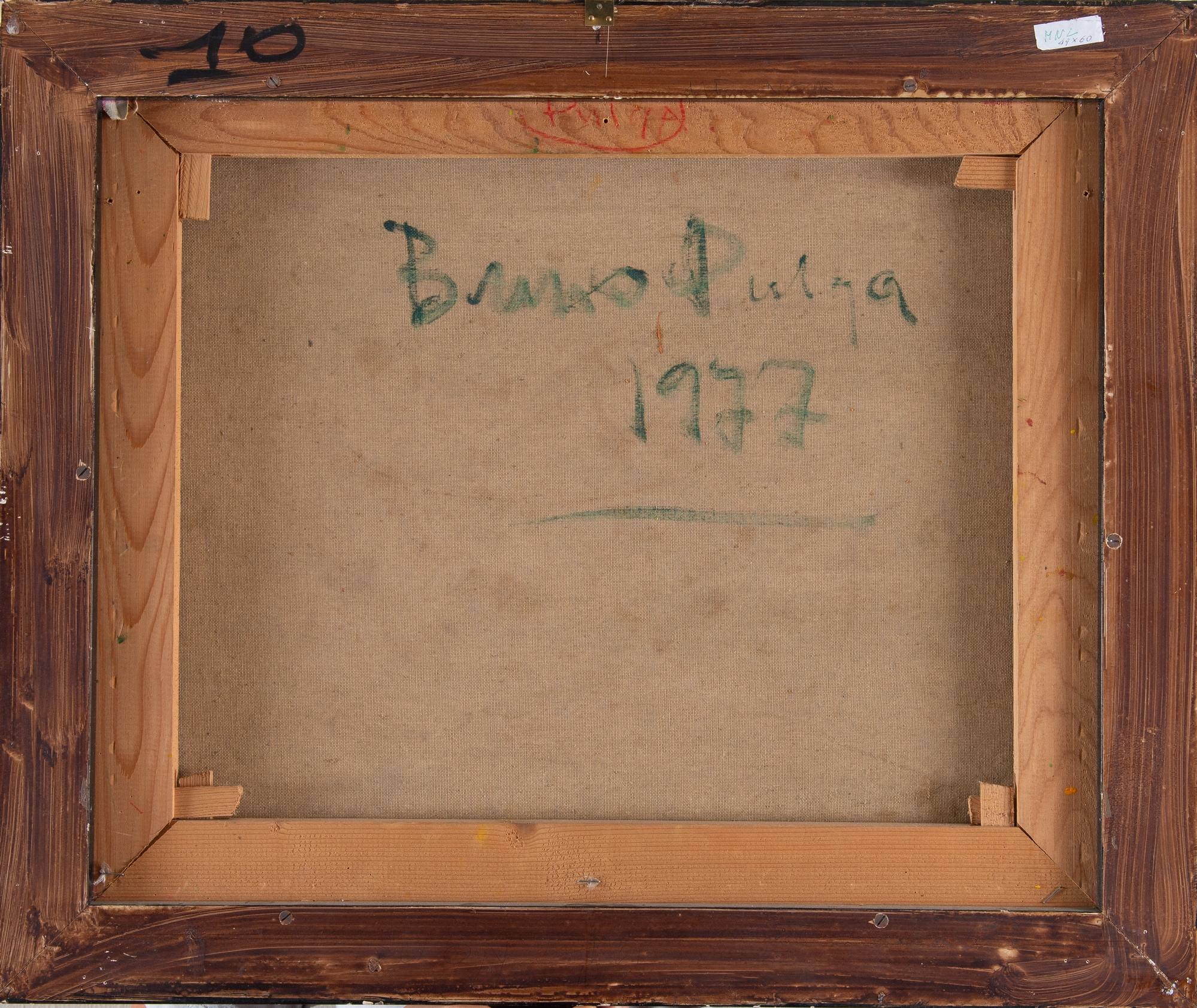 BRUNO PULGA (Bologna 1922 - 1992) “Composizione”, 1977. Olio su tela. Cm 49x60. Opera firmata e datata al retro Bruno Pulga 1977.