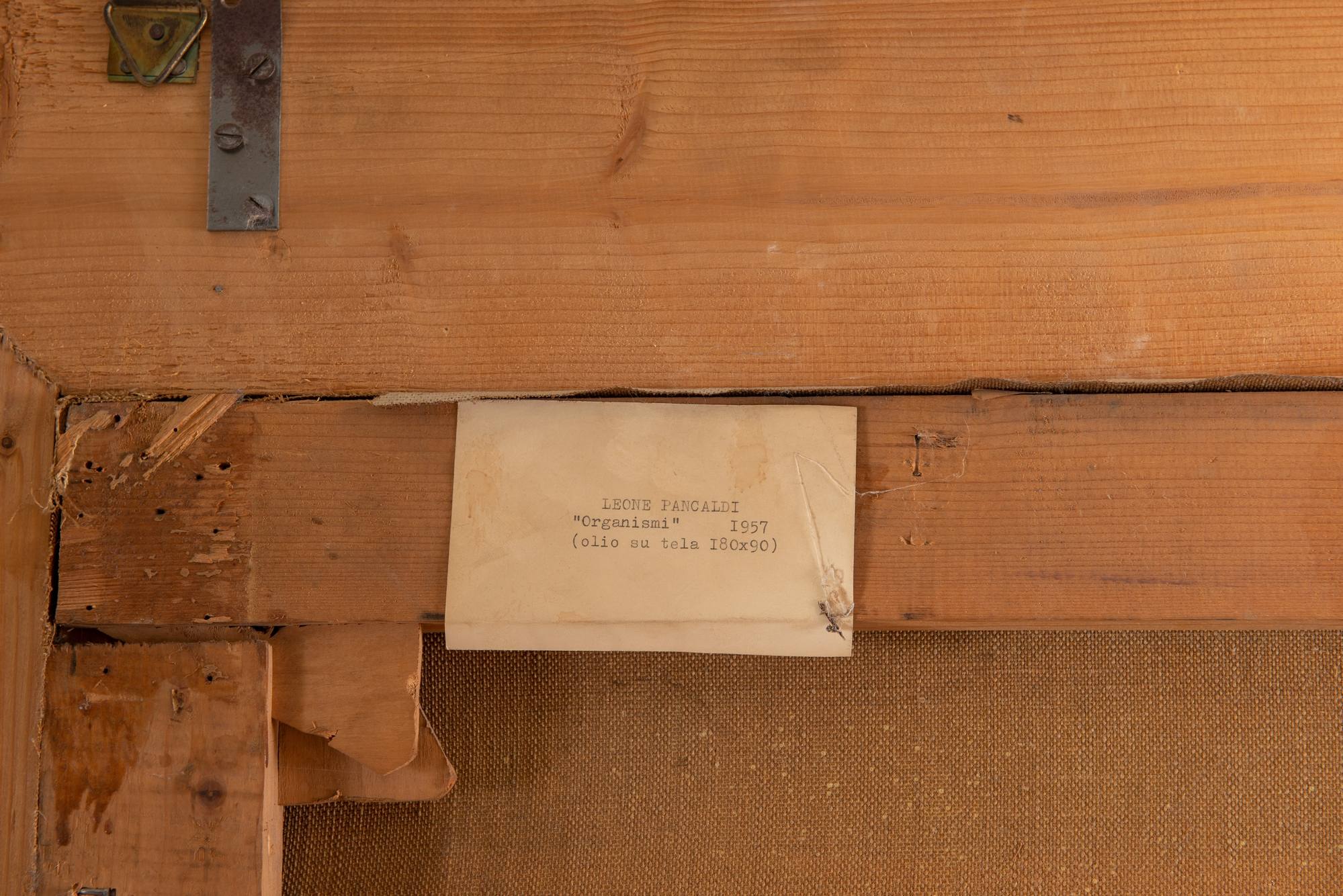 LEONE PANCALDI “Organismi”, 1957. Olio su tela. Cm 90x180. Opera firmata e datata in basso a destra Pancaldi 57. Al retro reca etichetta Leone Pancaldi Organismi 1957. Opera accompagnata da autentica della famiglia su fotografia.