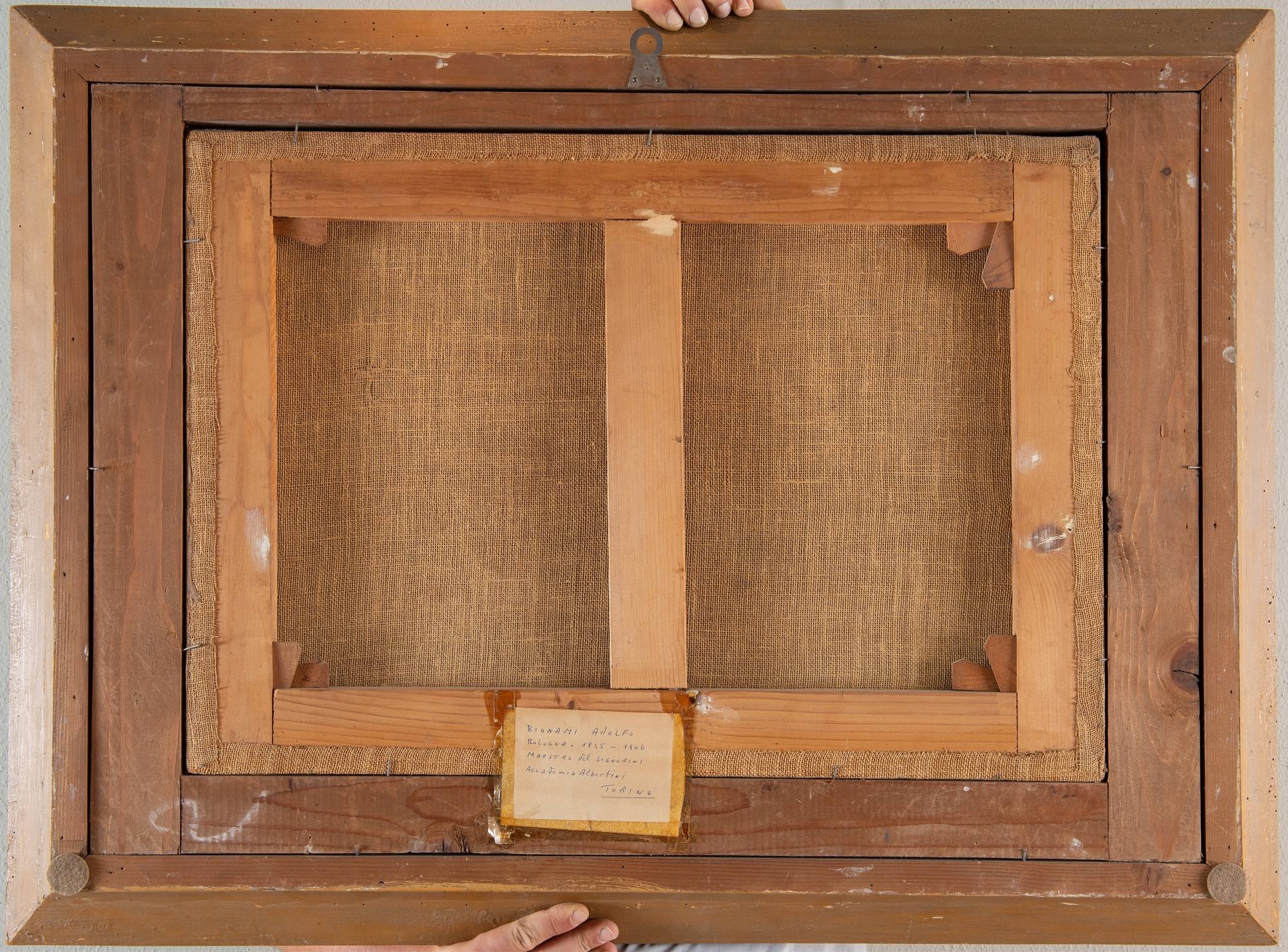 ADOLFO BIGNAMI (Bologna 1845 – 1906) “Paesaggio”. Olio su tela. Cm 47x67. Opera firmata in basso a sinistra A. Bignami. Al retro reca cartiglio.