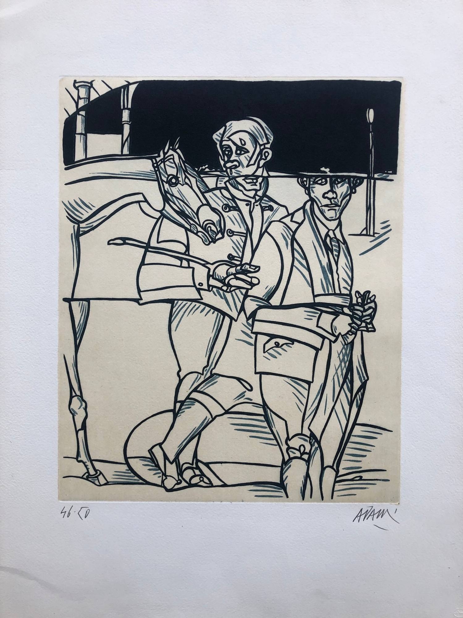 VALERIO ADAMI (Bologna 1935) “Senza titolo”. Litografia a colori su carta. Foglio: cm 75,5x55,5. Opera firmata in basso a destra Adami e con numeri di tiratura in basso a sinistra 46/50.