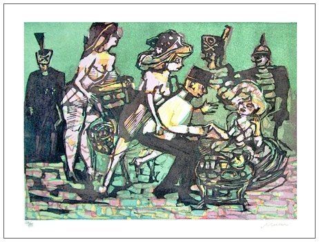 MINO MACCARI Siena 1898 – Roma 1989 Senza titolo Acquatinta a colori es.24/55. Firma in b. a d. + timbro a secco Nemo Galleni in b. a s. (50,5 x 70 foglio – 39,2 x 55 inc.)