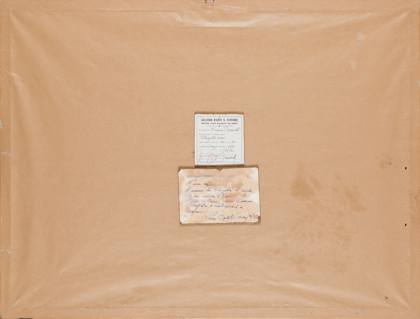 Dichiarazione di autenticità, scritto dell'Artista e cartiglio con timbro della Galleria d'Arte S. Stefano (NO) al retro