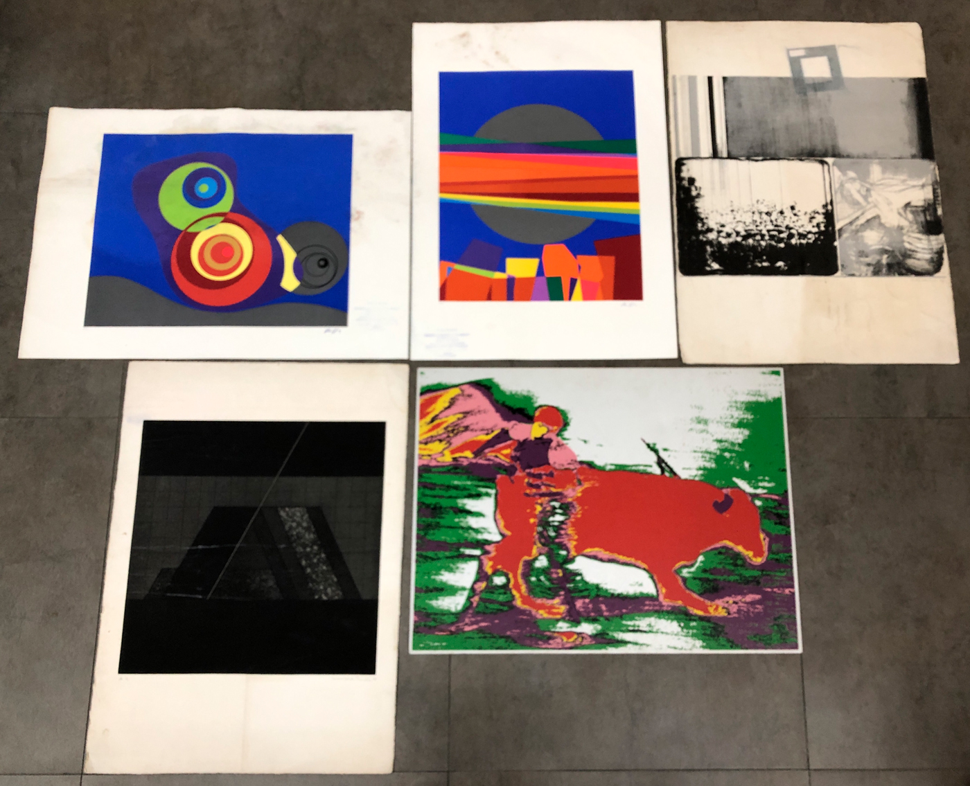 Lotto unico composto da 2 riproduzioni serigrafiche di Roberto Crippa e 2 acqueforti di Walter Valentini e 1 serigrafia su alluminio di David Lees