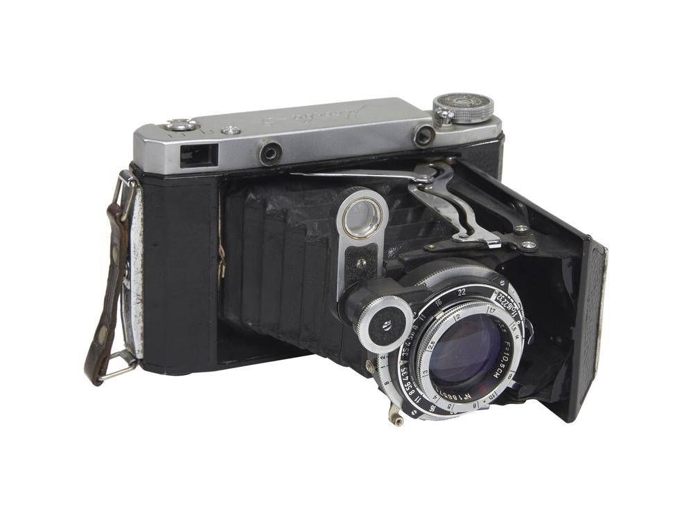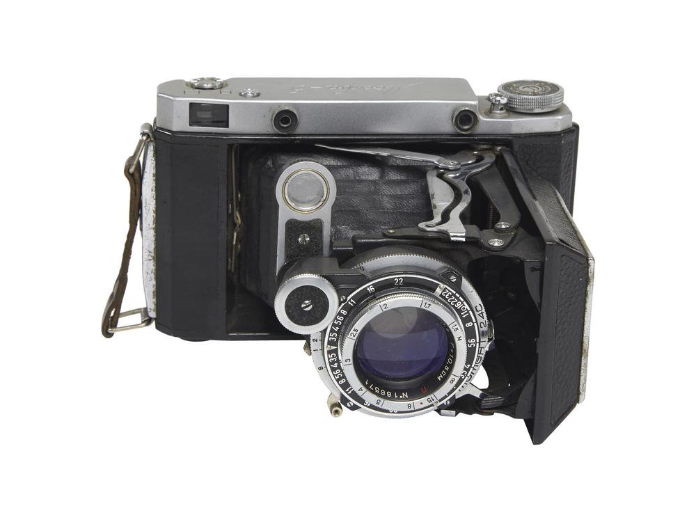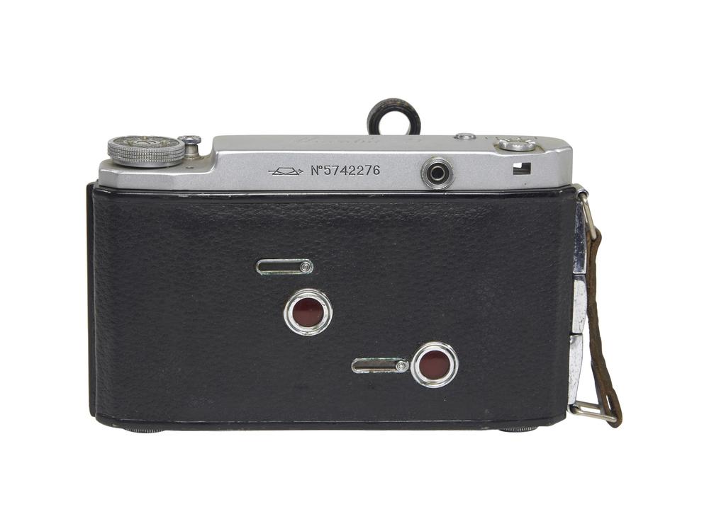 La storica macchina fotografica pieghevole a telemetro formato 6x9 cm o 6x6 cm. Prodotta dal 1956 al 1960, in 216.457 esemplari. Utilizza pellicole tipo 120. Dotata di ottica Industar-23 10.5 cm f. 3.5 con matricola n°186571. Condizioni da normale utilizzo. Non testata. Possibili malfunzionamenti e/o parti mancanti.