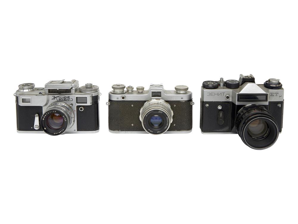 Lotto di tre macchine fotografiche Sovietiche/Russe obiettivo compreso 1....
