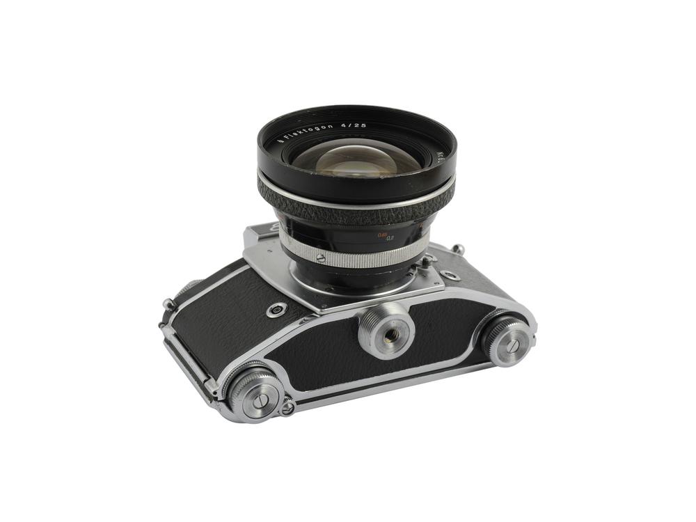 A 35 mm SLR camera produced in Germany. Equipped with a Carl Zeiss Jena Flektogon 25 mm f. 4 lens with serial number 6374178. Camera body and lens are both rare pieces. It is in a chrome finish and black coating. In a good condition and fully functional.