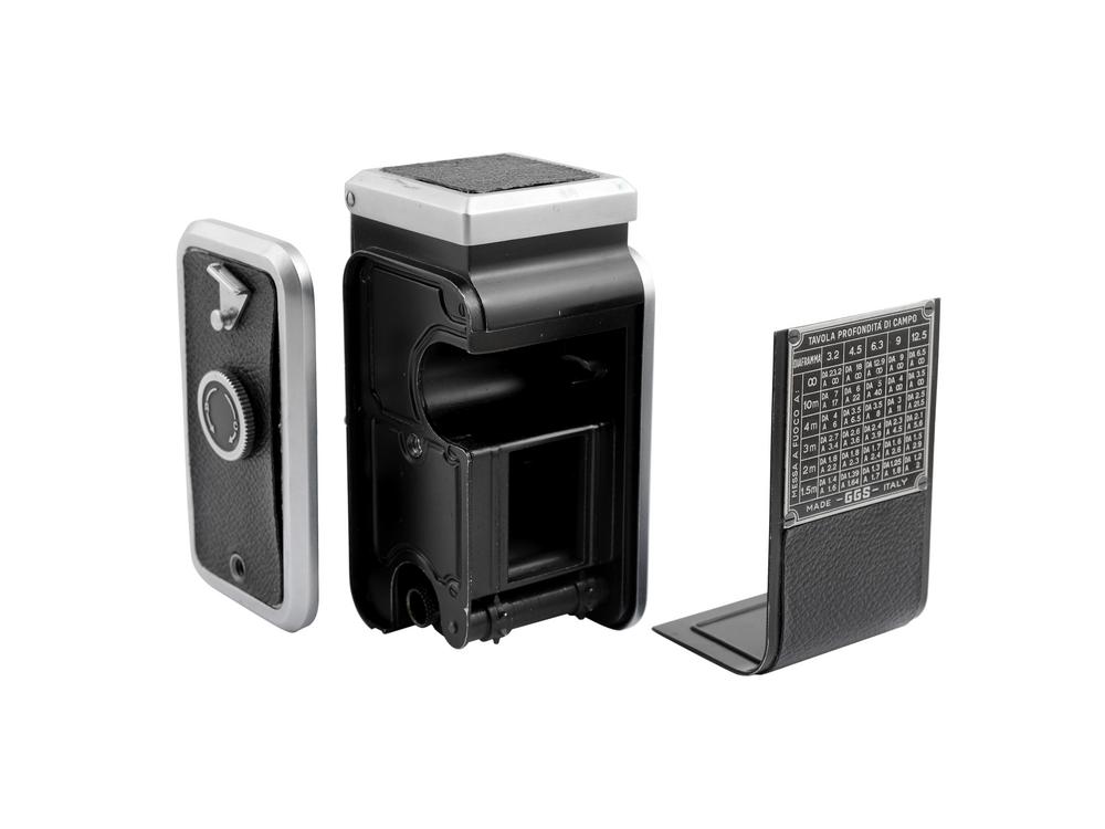Rara macchina 35 mm TLR prodotta in Italia, da un azienda Milanese verso la fine degli anni 40. E' dotata di doppia ottica Solar Anastigmat 50 mm f. 3.2. Complessivamente in buone condizioni e perfettamente funzionante.