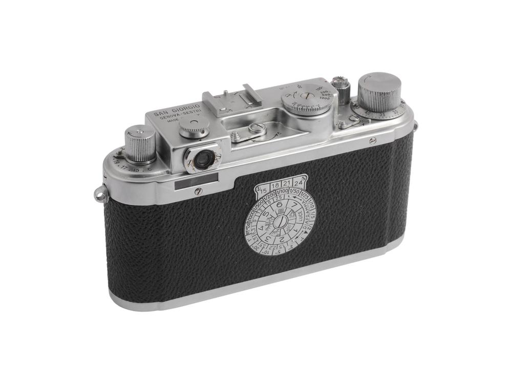 Rara macchina 35 mm SLR a telemetro, copia della Leica prodotta in Italia. Dotata di obiettivo San Giorgio "ESSEGI" 5 cm f. 3.5. Completa di custodia in cuoio e documentazione originale. In ottime condizioni e perfettamente funzionante.