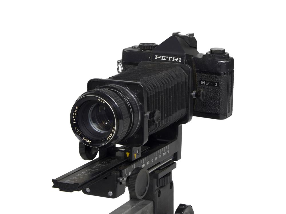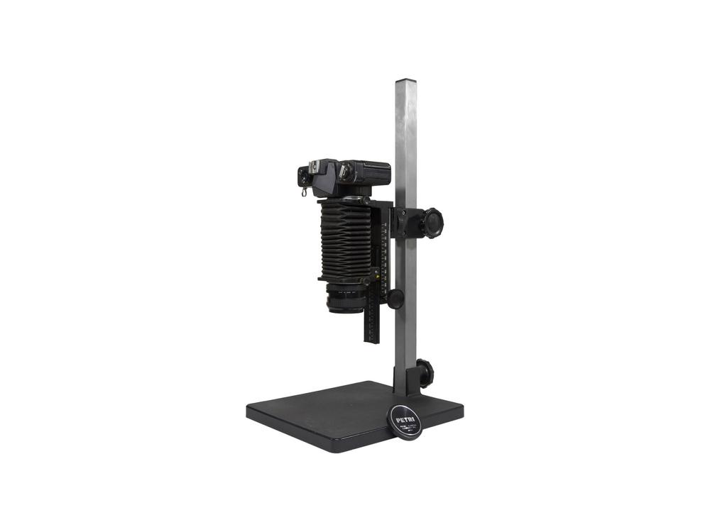 Petri MF-1 camera body with macro bellows and stand with a reproduction base. Equipped with C.C Auto Petri 50 mm f. 1.7 lens. In a good aesthetic condition. Not tested. Possible malfunctions and/or missing parts.
