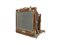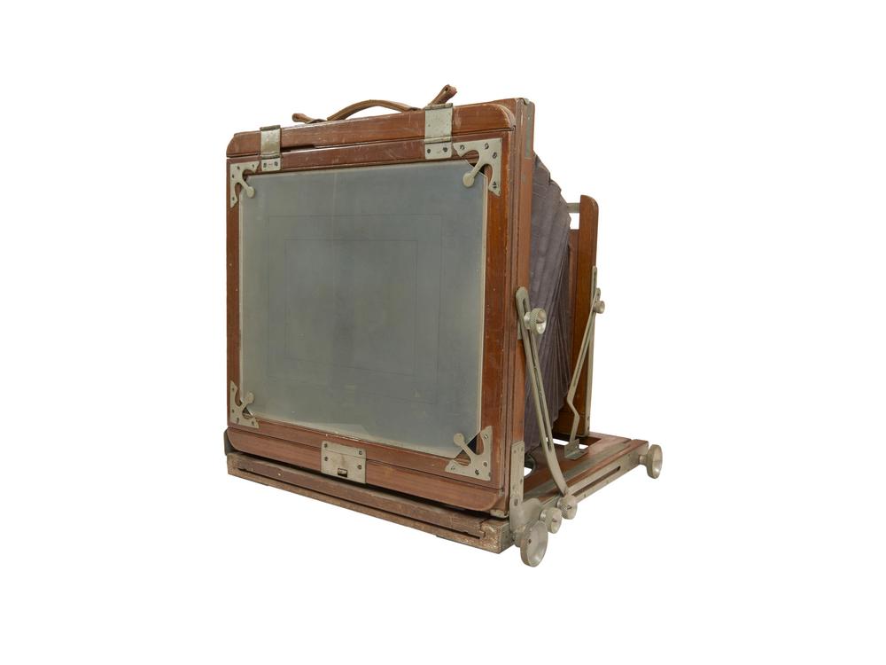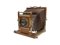 Banco ottico pieghevole in legno formato 29.5x25 cm. Maniglia in cuoio, finiture e meccanismi in ottone. Completo di vetro smerigliato di messa a fuoco e ottica in ottone. Le parti in legno e il soffietto sono in buone condizioni. Con comprensibili, pochi, segni d'uso dovuti all'età.