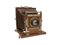 A folding optical bench in wood in the 29.5x25 cm format. Leather handle, brass finishes, and mechanisms. Complete with a focusing screen and a brass lens. The wooden parts and the bellows are in a good condition. With a few signs of use giving the age.