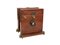 A folding optical bench in wood in the 18.5x18.5 cm format. Brass finishes and mechanisms. Complete with a focusing screen and Hugo Meyer Trioplan 18 cm f. 6 lens with serial number 392817. The wooden parts and the bellows are worn. Missing wooden rail. With understandable signs of use giving the age.