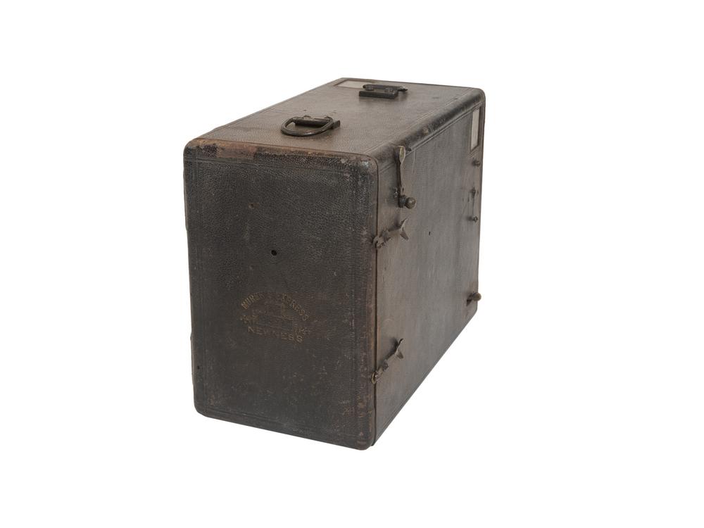 A detective Box Camera in the 9x12 cm format with three vintage plate holders included. In leather and equipped with a fixed brass optics. In a good condition, with understandable signs of use giving the age.