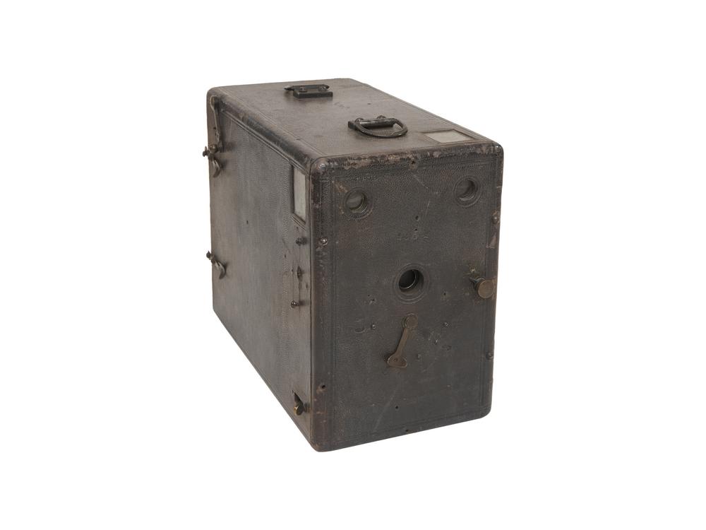 Box Camera di tipo detective formato 9x12 cm con tre porta lastre dell'epoca incluse. Rivestita in pelle e dotata di ottica fissa in ottone. Nel complesso in buone condizioni, con comprensibili segni d'uso dovuti all'età.