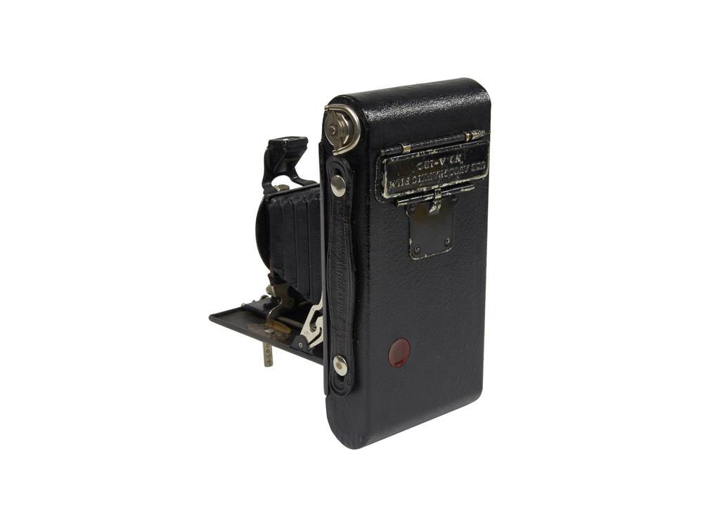 Folding Camera using 120 film format. Equipped with Kodak Ball Bearing shutter. Having a special film, the camera could allow the photographer to add handwritten notes that became visible only after the development of the film. In a normal use condition. Not tested. Possible malfunctions and/or missing parts.