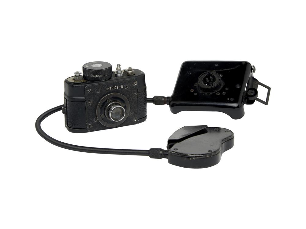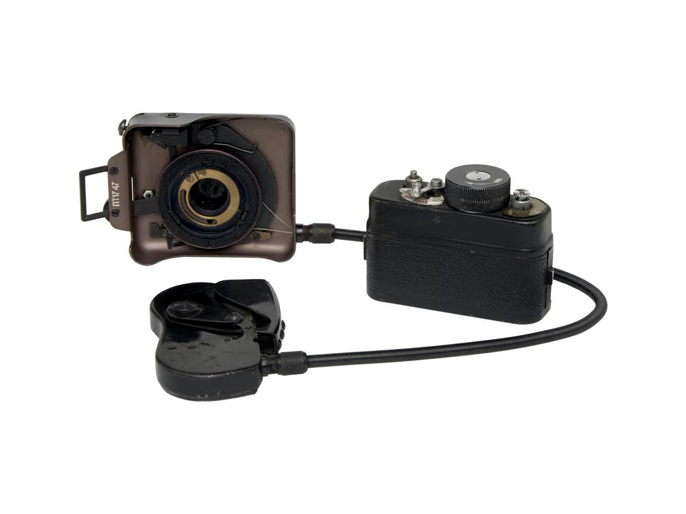 A Soviet spy camera without viewfinder produced for KGB and STASI secret services. It works with a special magazine film that served to secret agents. Includes the original accessory for remote shooting. In a good condition, with understandable signs of use giving the age. Not tested. Possible malfunctions and/or missing parts.