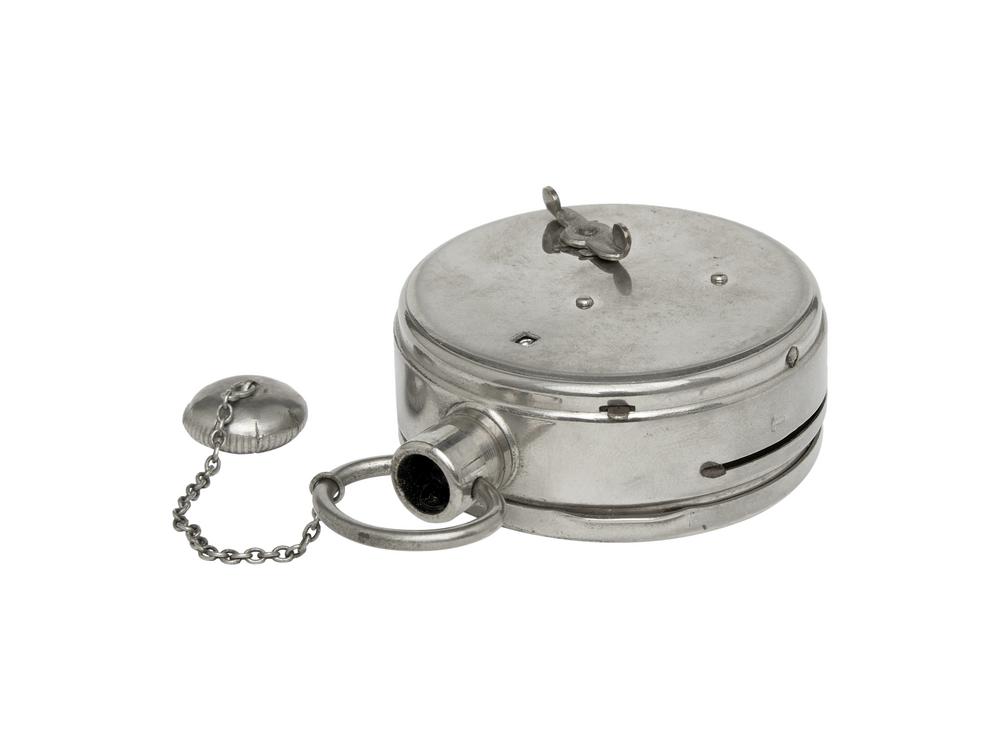 A spy camera that takes a pocket watch look. It uses 16x22 mm film with a 25-exposure cassette magazine. The lens is located at the top, where the watch's winding mechanism is usually placed. In a good condition, with understandable signs of use giving the age. Not tested. Possible malfunctions and/or missing parts.
