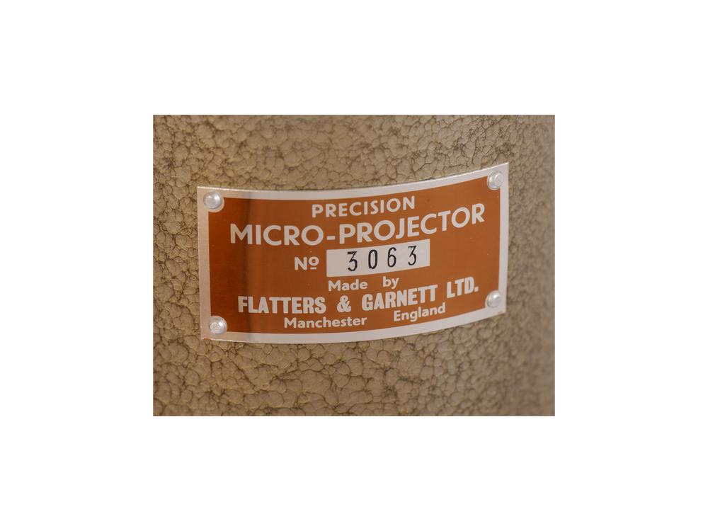 A precision micro-projector manufactured by Flatters & Garnett Ltd. in Manchester. Complete with lamp holder, condenser with iris diaphragm, electric lighting, liquid chamber, adjustable mirror, and three lens turret. An identical piece is exhibited at the Museum of the History of Science in Oxford. In excellent condition.
