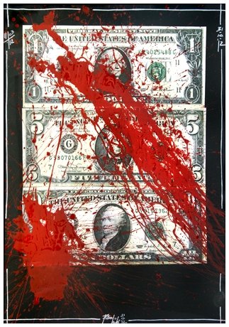 PETER HIDE 311065 (Franco Crugnola) Tradate 1965 Blood money 2012 Smalto, t.m. e collage su cartoncino 70 x 50. Firma e data in b. al c., altre date in a. a s. e a d. Autentica dell’autore su foto.