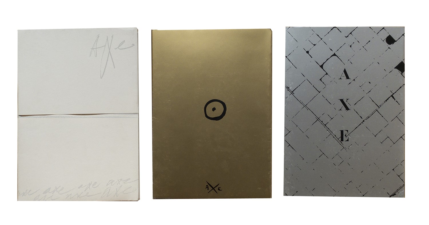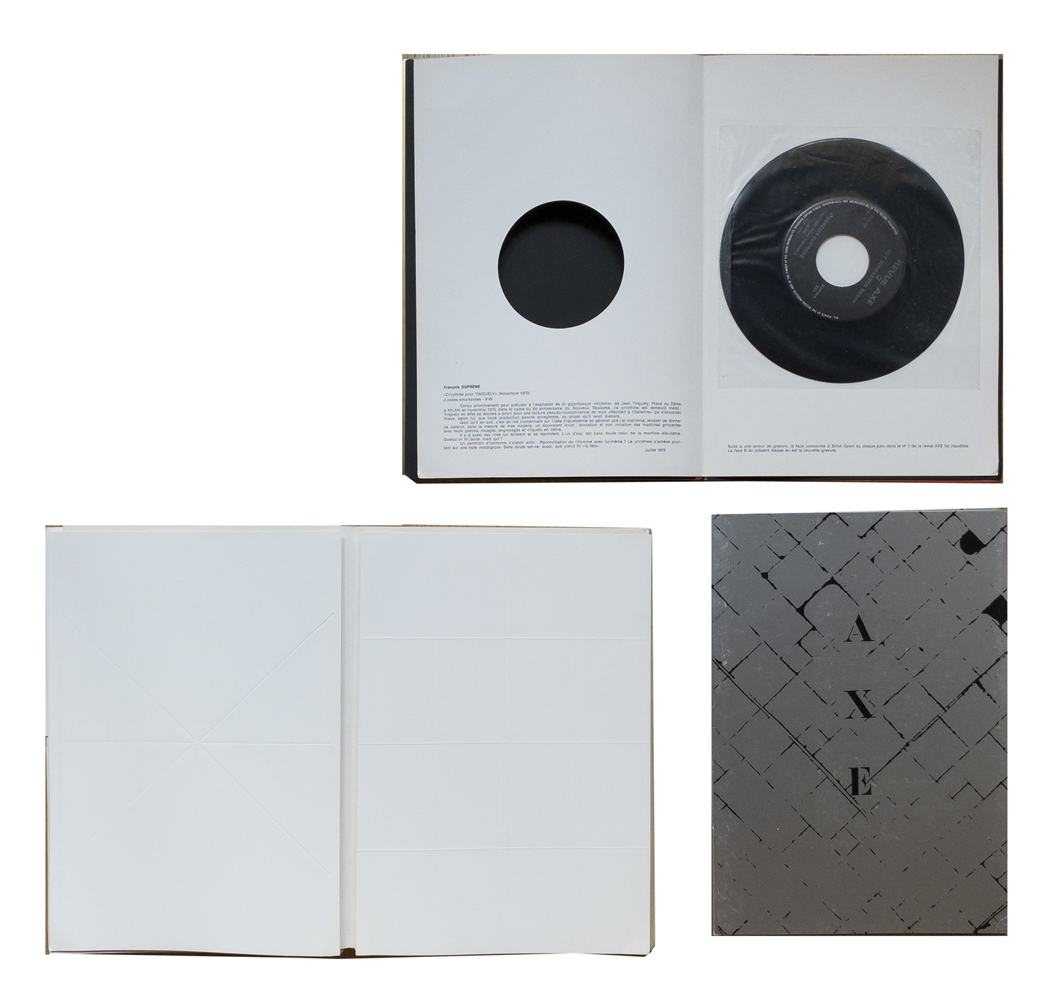 Contenuto dei fascicoli in dettaglio:AXE n. 1 (10 aprile 1975). Tiratura complessiva di 500 copie numerate. Esemplare nella tiratura ordinaria di 350, che non comprende l’opera originale di Roy Adzak, contenuta solamente negli esemplari numerati da 1 a 10. Copertina originale stampata in serigrafia di Jean Degottex. - 1 tavola stampata in bianco e nero con il testo programmatico: “Redécouvrir le passé à la lumière du présent, et decouvrir le présent en connaissance du passé”. - Jean Degottex, «Notes paralléles aux Médias», poster 60x126 cm., stampa in offset in grigio su fondo bianco, al solo recto. - 1 disco a 33 giri, 17 cm. di diametro, in busta trasparente, con foglio protettivo. Lato 1: Henri Chopin, «Air vibratoire» (1973 e non 1975 come dichiarato all’indice); Lato 2; Bryon Gysin, «Where is that world» (1974) - «In the beginning was the world» (1960) - «In a palace, in a palace, spoon, spoon, spoon». - Luc J.P. Schelfhout, «Trois pliages», cartellina contenente tre opere originali su carta 30x20,8 cm., con piegature. - Ung No Lee, «Photos prises à l’Atelier Annick Le Moine - Paris 1974», 2 immagini fotografiche stampate su cartoncino in nero su fondo grigioverde; e «Le centre du coeur», serigrafia originale 29x20,4 cm. - Eduard Bal e Guy Schraenen, «Photos extraites du film Ornithologie, publiées précédemment dans le catalogue de l’esposition Aspects de l’art actuel en Belgique, I.C.C. Anvers», poster 41,5x60 cm., una immagine fotografica al recto e 4 immagini fotografiche al verso, stampa in grigio su fondo bianco. - Bernard Heidsieck, «Notes convergentes - pages 1 à 15», cartellina contenente 16 fogli su carta bianca, giallina, rosa pallido, verde acquamarina, du cui 15 numerati, con la riproduzione del testo dattiloscritto, redatto tra il marzo 1967 e il marzo 1968. Testo inedito. - Bram Bogart, «Carte postale publiée dans le cadre de l’édition 16 cartes postales de...», cartolina 15x10,5 cm., con un disegno in bleu e giallo su fondo bianco. - Mirtha Dermisache, «Article pour la revue Axe», plaquette di 4 pagine, redatte secondo un alfabeto totalmente inventato. Stampa in bianco e nero. - Nico van Daele, «Lettre à moi même», lettera stampata in verde su fondo bianco, inserita in una busta postale aperta applicata su cartoncino. - Paul van Ostaijen, «Page manuscrite de Bezette Stad, ainsi que la réalisation typographique de l’édition de 1921», poster 60x42 cm., stampato al recto e al verso. Al recto la riproduzione della pagina a stampa, al verso la riproduzione del testo manoscritto. AXE n. 2 (28 novembre 1975).Tiratura complessiva di 500 copie numerate. Esemplare nella tiratura ordinaria di 350, che non comprende le opere originali di François Dufrêne e Fabrizio Plessi contenute solamente negli esemplari numerati da 1 a 10. - copertina originale con piccola immagine in nero su fondo oro di René Guiette. - René Guiette, «Vestiges», poster in cartoncino 29,7x100 cm., con 4 segni calligrafici, stampa in bianco e nero al solo recto. - Fabrizio Plessi, «Water art. 9 manières de couper l’eau», cartellina in carta color acquamarina contenente 3 tavole, ciascuna con 3 immagini fotografiche che ritraggono l’artista durante l’azione. - Esmeraldo, «Excitable», multiplo contenuto in una cartellina nera col nome dell’artista in bianco bfrazionato in lettere in libertà. Sacchettino di plastica con all’interno minuscoli ritasgli di carta bianca e color oro, con applicato al verso della prima pagina un biglietto: “Ouvrez, gonflez, fermez et frottez légèrement”. - 1 disco a 33 giri, 17 cm. di diametro, in busta trasparente, con foglio protettivo. Lato 1: François Dufrêne, «Crirythme pour Tinguely» (novembre 1970); Lato 2: Bryon Gysin, «Where is that world» (1974) - «In the beginning was the world» (1960) - «In a palace, in a palace, spoon, spoon, spoon». Si tratta dello stesso pezzo riprodotto sul disco contenuto nel n. 1 della rivista. La nota esplicativa sul foglio protettivo spiega che quest’ultima riproduzione sostituisce quella inudibile pubblicata precedentemente. - Hugo de Clercq, «Carte postale publiée dans le cadre de l’édition 15 cartes postales de...», cartolina postale 10,5x14,8 cm., stampa in bianco e nero. - Antoine de Bary, «Cahier», plaquette di 8 pagine stampate in bianco e nero con segni sovrapposti a righi musicali e strisce di carta reasparente gialle e verdi applicate. - Maurice Benhamou, «Tension superficielle», poster 58x42 cm., stampa in grigio su fondo nero, al recto e al verso. Riproduzione di un testo manoscritto. - Bernard Heidsieck, «Notes convergentes - pages 16 à 29». Cartellina contenente 12 fogli numerati su carta bianca, giallina, rosa pallido, verde acquamarina, con la riproduzione del testo dattiloscritto, redatto tra il marzo 1967 e il marzo 1968. Testo inedito. AXE n. 3 (18 dicembre 1976). Tiratura complessiva di 500 copie numerate. Esemplare nella tiratura ordinaria di 350, che non comprende le opere originali diBrion Gysin e Bernard Heidsiek contenute solamente negli esemplari numerati da 1 a 10. - Copertina originale stampata in nero su fondo argento di Brion Gysin. - Brion Gysin, «Brion Gysin», poster 82x30 cm., stampa in nero su fondo argento al solo recto, contenuto in una cartellina con lo stesso motivo grafico riprodotto all’interno in bianco su fondo nero. - Arrigo Lora-Totino, «Vedo-Dove», libro d’artista a fogli sciolti 30x21 cm., con diverse composizioni grafiche e trasposizioni delle parole “Vado - Dove - Vedo”. Stampa in bianco e nero. - Sten Hanson, «Oips», disco a 45 giri, 17 cm. di diametro, in busta trasparente, con foglio protettivo. - Klaus Ritterbusch, «Oh wie ich deine Kurven liebe», poster pieghevole 29,7x82 cm., con 4 immagini fotografiche applicate. - Jo Delahaut, «Carte postale publiée dans le cadre de l’édition 15 cartes postales de...», cartolina postale 10,5x14,8 cm., stampa in nero e ross