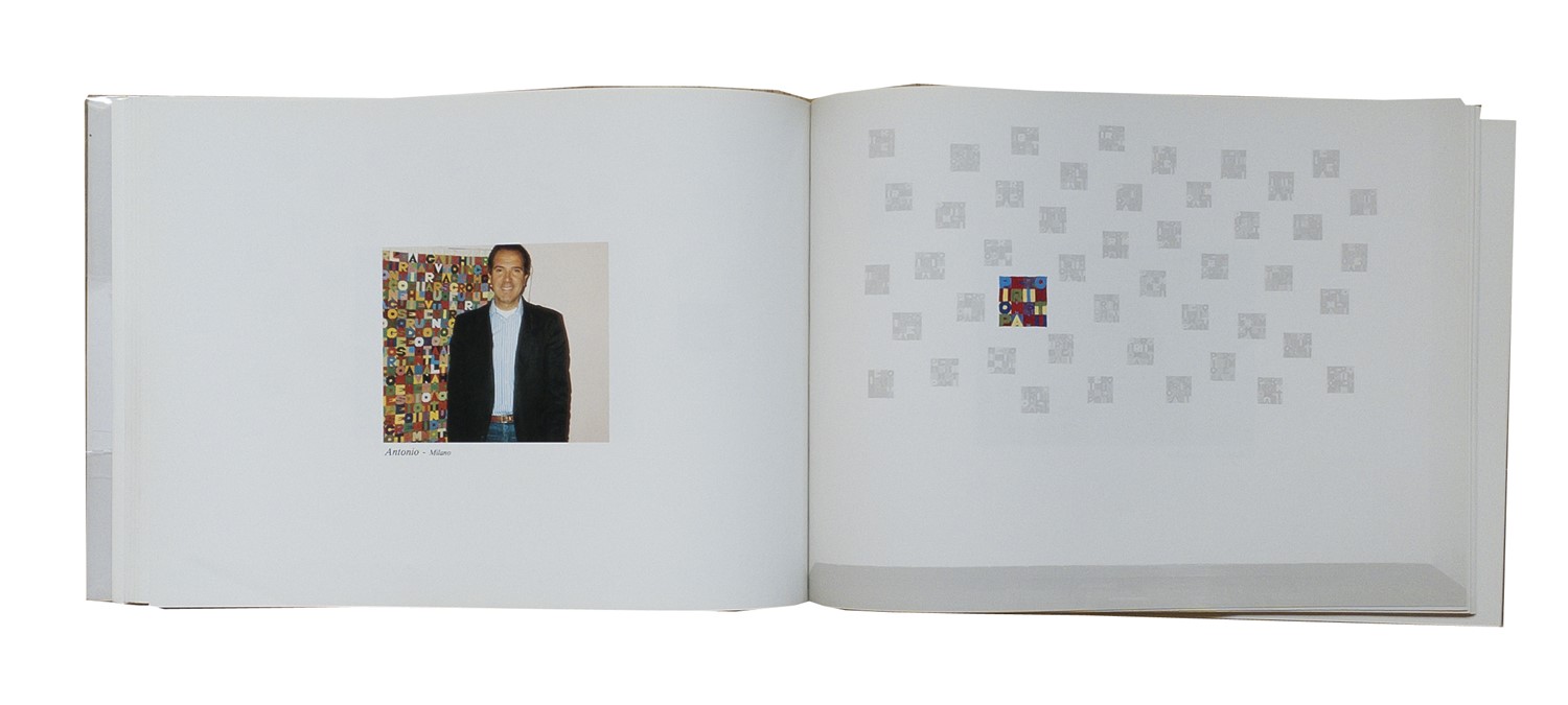 Prima opera: “Nell’occasione della personale a Roma nella Galleria Pio Monti, Boetti realizza cinquantadue piccoli arazzi colorati con la stessa iscrizione «Pio per mari e monti», costruiti con il procedimento della «quadratura» e con la permutazione dei colori. Da questa operazione deriva il catalogo che con l’intervento grafico dell’artista diventa libro d’artista. L’omaggio all’amico gallerista si arricchisce con l’accostamento alle opere del ritratto di persone che fanno parte del suo individuale «sistema dell’arte», alle quali sono personalmente dedicate le opere. I galleristi, i critici, gli artisti, i collezionisti sono il tessuto connettivo di una narrazione fatta di affetti, relazioni e memorie...” (Maffei-Picciau).