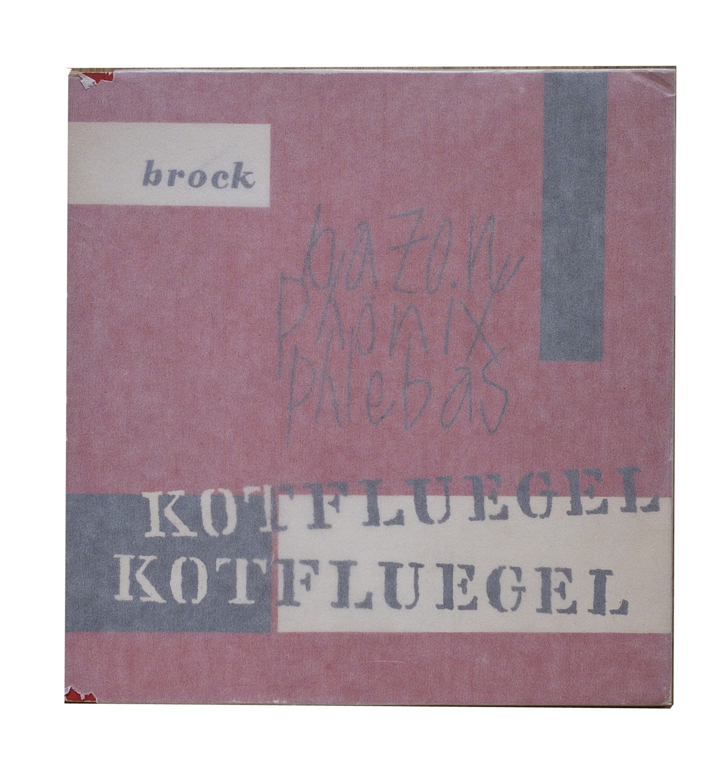 Kotfluegel - Sprechmaschine nackt im Damenjournal - 80 junge Papierschnitzel oder die Entwicklung eines Wortkonzerts in durchgeführter Sprache - mit einer Anleitung zum vergnügten und gelassenen Sterben - samt allgemeiner Beleuchtung sowie neuer Theorie des Himmelss.l., edizione a cura dell’autore, 1957, 20,8x20 cm., brossura fresata, pp. [2]-52-[2].