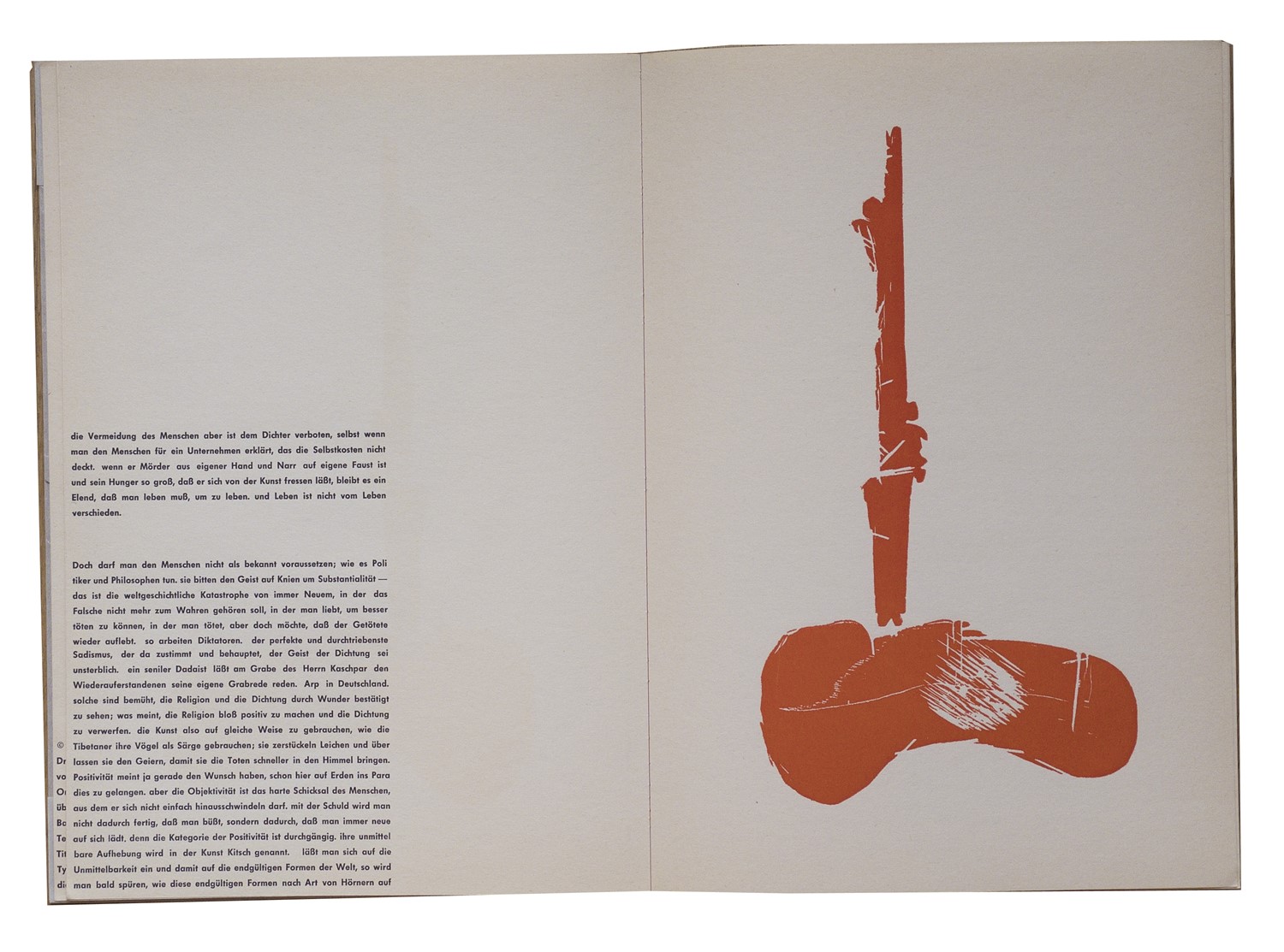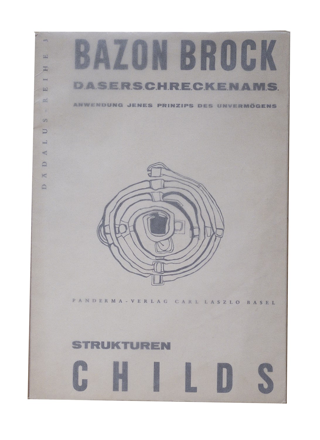 Copertina con composizione grafica dei titoli su fondo rosso, bianco e nero. Libro d’artista stampato su carta forte di diversi colori, composizioni poetiche e segni variamente disposti sulle pagine. Opera prima. - Unito: BROCK Bazon - CHILDS Bernhard (New York 1910 - New York 1985), D.A.S.E.R.S.C.H.R.E.C.K.E.N.A.M.S. Anwendung jenes Prinzips des Unvermögens - Strukturen Childs, Basel, Panderma Verlag Carl Laszlo, “ Dädalus-Reihe 3”, [stampa: Rundschau Druckerei und Verlagsanstalt - Itzehoe], 1960, 28,6x19,8 cm., brossura fresata, pp. 74 n.n., copertina illustrata con un disegno in bianco e nero, 4 serigrafie a piena pagina stampate in rosso di Bernhard Childs. Tiratura complessiva di 500 copie numerate di cui 50 con i disegni originali. Esemplare facente parte dei 450 in tiratura ordinaria.