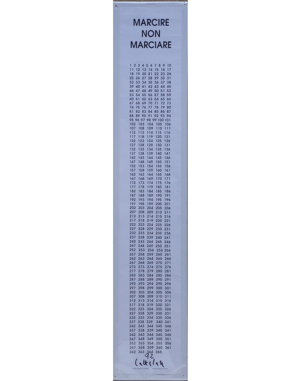 Esemplare firmato e datato dall’artista. “(…) tra gli slogan di propaganda fascista, coniati durante la guerra, [Cattelan] sceglie un motto d’azione di Marinetti utilizzato alla rovescia “MARCIRE NON MARCIARE”. Il lavoro aggiunto dell’artista è l’operazione di scelta, l’individuazione dell’oggetto, l’acquisizione e il suo isolamento…” (da un articolo pubblicato in ART&trA, Ottobre / Novembre, 2010).