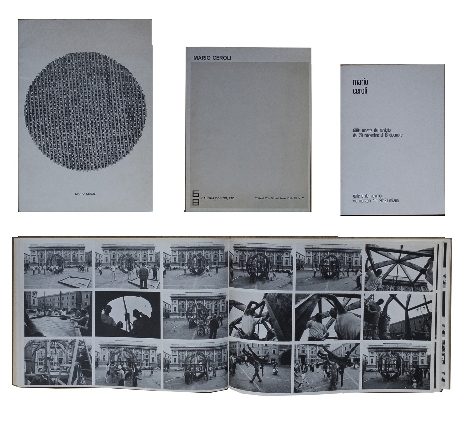 Copertina illustrata in bianco e nero, catalogo/libro d’artista interamente illustrato con immagini fotografiche in bianco e nero che testimoniano giorno per giorno le fasi di montaggio della mostra. Gli scatti fotografici sono di Ugo Mulas (nei giorni 21 e 22 giugno) e di Giorgio Colombo (nei giorni 24-25-26-27-30 giugno e 1-3-4-5-6-7-8-9-luglio). Graphic design a cura di Giorgio Colombo e Piera Crovetti. Tiratura di 5.000 copie. [Bibliografia: Liliana De Matteis - Giorgio Maffei, «Libri d’artista in Italia 1960 - 1998», (Torino), Regione Piemonte Assessorato alla Cultura Direzione ai Beni Culturali, 1998: pag. 115, n. 676]. - Unito: AA.VV., Mario Ceroli. 609ª mostra del naviglio, Milano, Galleria del Naviglio, 1972, 23x16 cm, brossura, pp. [16], copertina tipografica, catalogo illustrato con 17 immagini fotografiche in bianco e nero di Giorgio Colombo, edito in occasione della mostra tenutasi alla Galleria del Naviglio dal 29 novembre al 18 dicembre 1972.- Unito: AA.VV., Mario Ceroli, New York, Galeria Bonino LTD, 1967, 25x19 cm., brossura, pp. (12), 11 tavole b.n. n.t. catalogo della mostra. Bella dedica autografa dell’artista: “a Ciaccia con gli auguri di volare con ali di legno”. - Unito: AA.VV., Mario Ceroli, Bologna, Galleria de’Foscherari, 1977, 29,5x21 cm., brossura, pp. 12, 4 illustrazioni b.n. n.t. Testi di Vittorio Boarini, Pietro Bonfiglioli e Egidio Lomi. Catalogo originale della mostra (Bologna, Galleria de’Foscherari, febbraio - marzo 1977).
