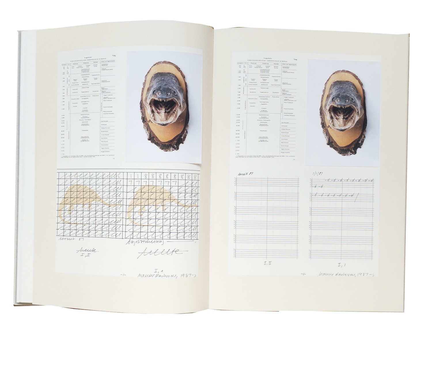 Libro d’artista illustrato con 28 tavole fotografiche a colori applicate (un uccello e una testa di pesce imbalsamati) e oltre 800 immagini, testi, diagrammi e partiture musicali dell’artista in facsimile degli originali manoscritti. Copia speciale con un intervento originale dell’artista a matita sul frontespizio (5 linee con numerazioni), una breve nota manoscritta a pagina 241 e un monogramma all’occhietto a fianco del titolo. In appendice un testo di Coosje van Bruggen. Tiratura di 300 esemplari complessivi. Copia n. 44 in numeri arabi.