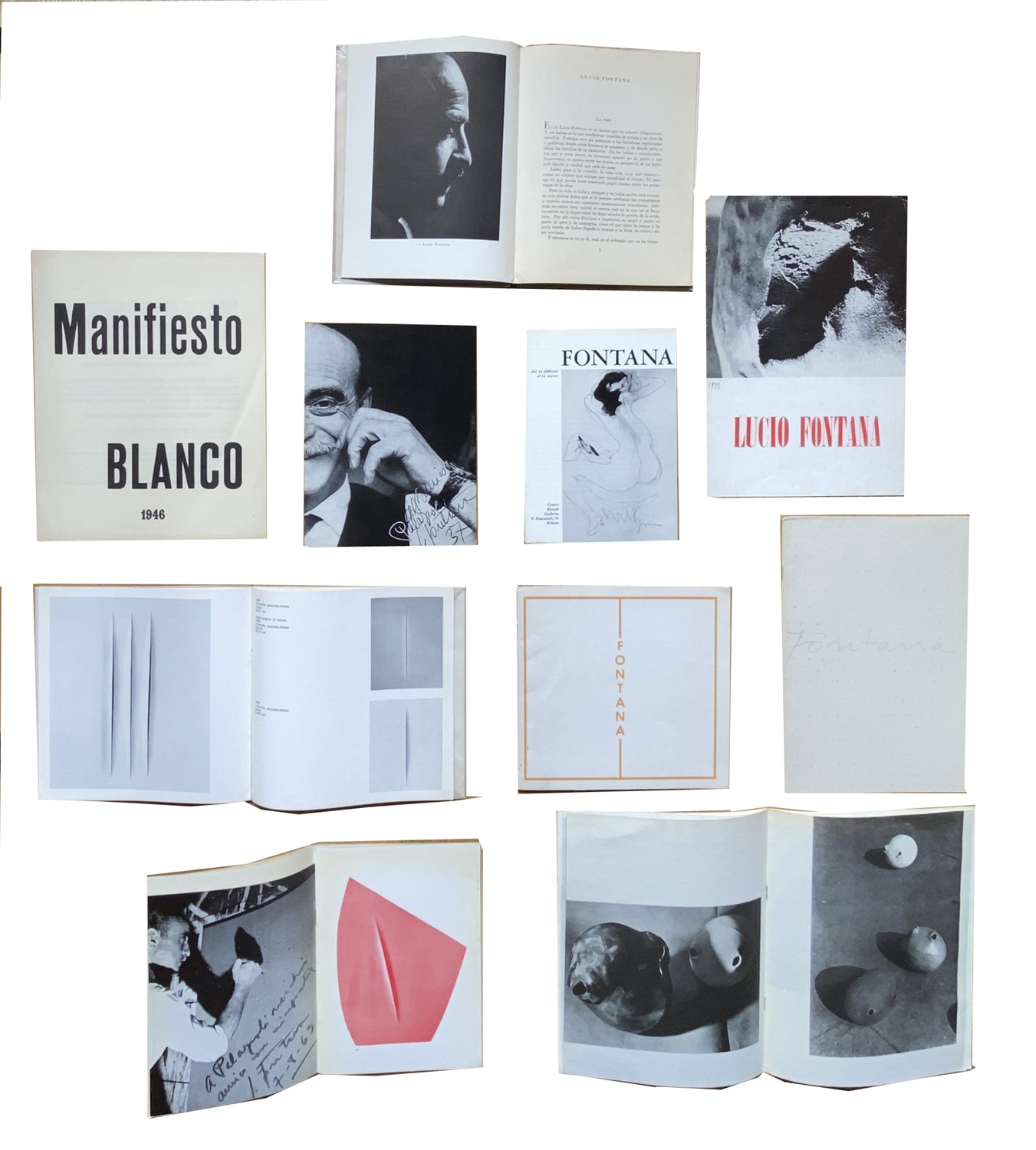 Riproduzione in fac-simile manifesto dichiaratorio di Lucio Fontana, edito a Buenos Aires nel 1946. Esemplare con alcuni segni di piegature.- Unito: FONTANA Lucio - ZOCCHI Gaetano (S. J.), Lucio Fontana por Juan Zocchi. 60 reproducciones en negro y 4 en color, Buenos Aires, Editorial Poseidon, 1946, 22,8x17,5 cm., legatura editoriale cartonata, dorso in tela, pp. 84, 4 tavole a colori f.t. e 60 disegni e illustrazioni b.n. n.t. Prima edizione. [Bibliografia: Enrico Crispolti, Lucio Fontana (Vol. II), Bruxelles, La Connoissance, 1974: pag. 219].- Unito: FONTANA Lucio, Lucio Fontana peinture scultpure, Zurich, Gimpel Hanover Gelerie, 1963, 21x26,7 cm, brossura, pp. [16], copertina illustrata a colori senza indicazioni tipografiche, 3 illustrazioni a colori e 5 in bianco e nero nel testo. Contiene uno scritto introduttivo di Pierre Rouve tradotto in inglese. Catalogo edito in occasione della mostra tenutasi alla Gimpel Hanover Galerie di Zurigo dal 21 Maggio al 15 Giugno 1963. - Unito: FONTANA Lucio, Fontana, Milano, Galleria Blu - Le Presenze, 1964, 23x16,5 cm, punto metallico, pp. [28], copertina illustrata con una riproduzione fotografica in bianco e nero, catalogo contenente 60 immagini fotografiche 3 delle quali a colori. Catalogo edito in occasione della mostra tenutasi dal 5 ottobre al 5 novembre 1964 alla Galleria Blu di Milano.- Unito: FONTANA Lucio - AA.VV., Fontana, Genova, Galleria La Polena, 1966, 21x21 cm., brossura, pp. (16), 15 tavole e illustrazioni b.n. n.t. Un testo di “Orlandini”. Catalogo originale della mostra (Genova, Galleria La Polena, 1-28 ottobre 1966).- Unito: FONTANA Lucio - AA.VV., Fontana, Amsterdam, Stedelijk Museum, 1967, 27,4x18,5 cm., brossura, pp. [32], copertina originale illustrata di Fontana e 33 tavole e illustrazioni b.n. n.t. Testi di Ad Petersen, Jan van der Marck, Alain Jouffroy, Pierre Rouve, Otto Piene. Catalogo originale della mostra (Amsterdam, Stedelijk Museum, 23 Marzo - 7 Maggio 1967).- Unito: FONTANA Lucio - KAISSERLIAN Giorgio, Lucio Fontana, Milano, Galleria Pagani, 1961, 29,5x19,8 cm., brossura, pp. 8, 1 illustrazione b.n. in copertina e due illustrazioni b.n. a piena pagina n.t.. Con un testo di Giorgio Kaisserlian. (Milano, Galleria Pagani, 18 febbraio 1961).- Unito: FONTANA Lucio - SCHMIED Wieland, Lucio Fontana, Hannover, Kestner-Gesellschaft, 1968, 20,8x16,3 cm., brossura, pp. 60-(16 pubblicitarie), copertina illustrata a colori, 8 tavole a colori e 28 tavole e illustrazioni in bianco e nero nel testo. Testi di Wieland Schmied, Kurt Leonhard, Jan Van der Mack, Lucio Fontana. Catalogo pubblicato in occasione della mostra (25 Gennaio - 25 Febbraio 1968) al Kestner-Gesellschaft di Hannover.