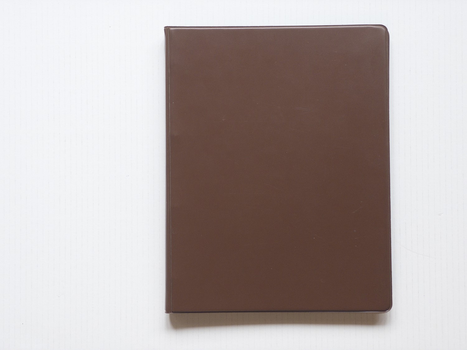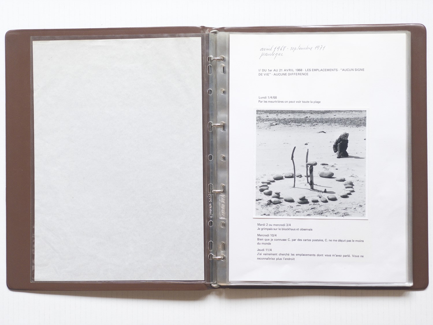 Classificatore ad anelli metallici in similpelle marrone, 24 fogli redatti fronte e retro (l’ultimo foglio solo fronte), inseriti in buste di plastica trasparente, libro d’artista autoprodotto con 30 fotografie originali in bianco e nero applicate nel testo. Tiratura di 25 esemplari numerati e recanti la dichiarazione “Il existe vingtcinq exenplaires sous cette forme” di pugno dell’artista. Esemplare n. 9, con timbro dell’artista, da lui datato e firmato in prima pagina.