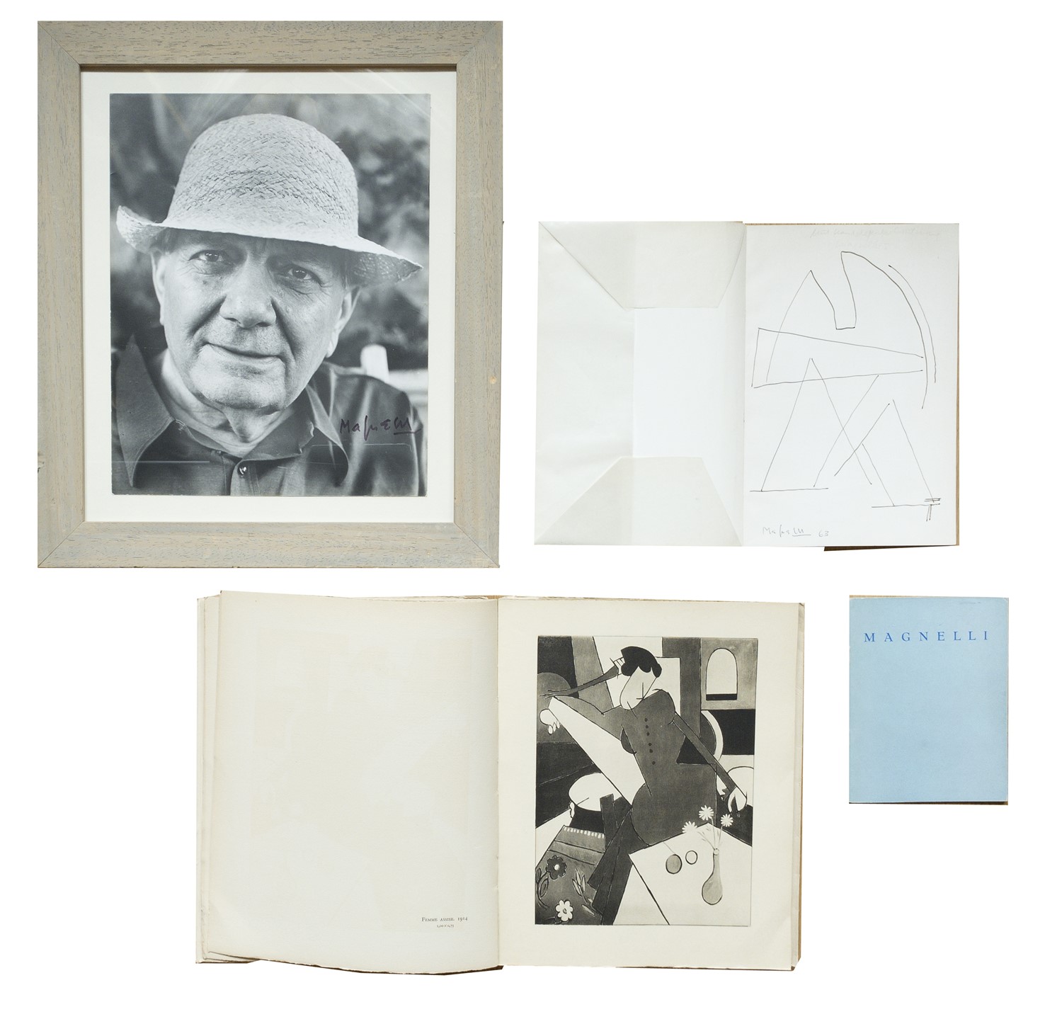 Copertina tipografica, 12 tavole a colori 48 illustrazioni in bianco e nero, testi di Franco Riussoli, Murilo Mendes, Jacques Lassaigne. Disegno originale a pennarello firmato e datato sulla prima pagina del catalogo e doppia dedica dell’artista. - Unito: MAGNELLI Alberto, Magnelli, Paris, René Drouin, 1947, 28x23 cm., brossura, pp. 68 n.n., 24 tavole in bianco e nero stampate in fototipia e 4 disegni n.t. Tiratura di 767 copie numerate. Esemplare facente parte dei 750 numerati con numeri arabi. Monografia pubblicata in occasione della mostra (Parigi, René Drouin, 1947).- Unito: MAGNELLI Alberto - DEGAND Léon, Magnelli, Bruxelles, Editions de la Connaissance S.A., 1954, 15,5x12 cm., brossura, pp. (36), 1 ritratto dell’artista e 22 illustrazioni in bianco e nero n.t. 1 Catalogo della mostra retrospettiva tenutasi a Bruxelles al Palais des Beaux-Arts. - Unito: MAGNELLI Alberto, Ritratto con cappello, (anni ‘60), 29,7x23,5 cm. fotografia originale in bianco e nero firmata dall’artista. Cornice in legno e vetro. Vintage.