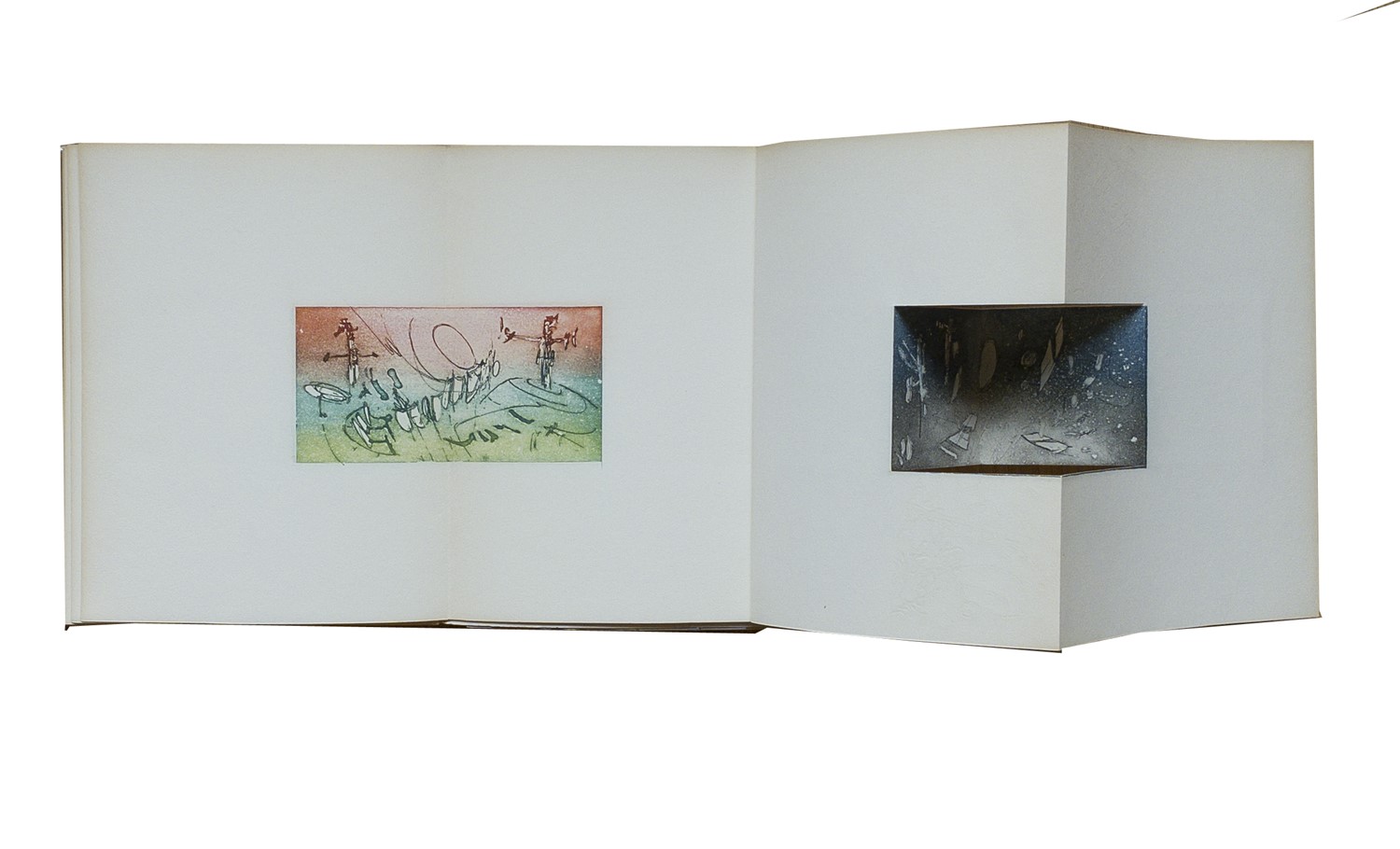 Copertina con titoli in nero su fondo bianco, doppia incisione originale a colori di Sebastian Matta su 4 pagine doppie con apertura pop-up in forma di cubo, vari disegni che accompagnano il testo a ogni pagina costituendo una unica sequenza. Testo in francese, inglese e italiano. Esemplare nella tiratura di 100 su Vélin à la cuve Rives BFK, numerato a macchina e con firma autografa di Sebastian Matta. Edizione di 900 esemplari complessivi così suddivisi: 600 esemplari su Van Gelder e 100 esemplari su Rives BFK con una incisione tridimensionale originale di Sebastian Matta; 200 esemplari fuori commercio riservati ai membri del Walker Art Center di Minneapolis. Prima edizione.