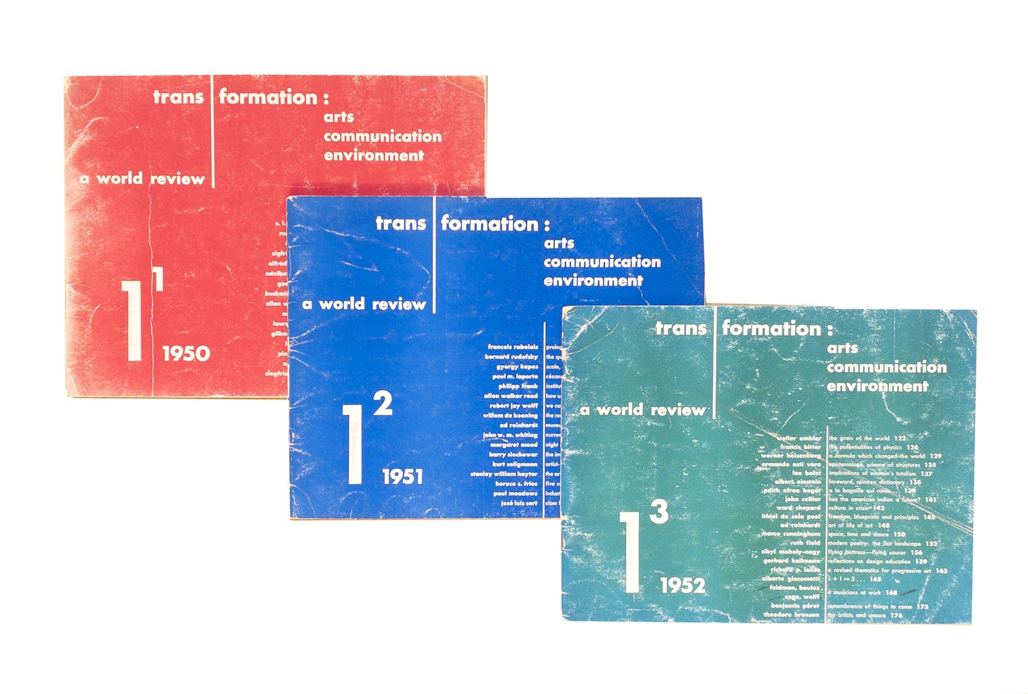 “Transformation it was a venue for a wide list of contributors from the areas of the arts and architecture; its fostering of a «holistic» approach to what was then called the «environment» could be thought as anticipating what was going to be fully developed and tested in the still to come «experiments» of the 1960s. While embedded in the art world, trans/formation was devoted neither to art nor to architecture but to a proposition that the arts and the sciences could be brought together in a common enterprise. To that end, the journal solicited contributions from natural and social scientists. Further, in addition to the CIAM contingent, it featured an array of other voices in the arts - Gyorgy Kepes, Buckminster Fuller, Marcel Duchamp, Ad Reinhardt, John Cage, Bernard Rudofsky-representatives of plural modernisms, «alternative» and «avant-garde». Trans/formation therefore encompassed within a single historical object positions that have often been conceived to be communicating along an axis of oppositions: major and minor, central and marginal, dominant and critical.” (Vallye, Anna.“The strategic universality of trans/formation, 1950-1952,” Grey room ,New York, no. 35 Spring 2009: 28-57.).