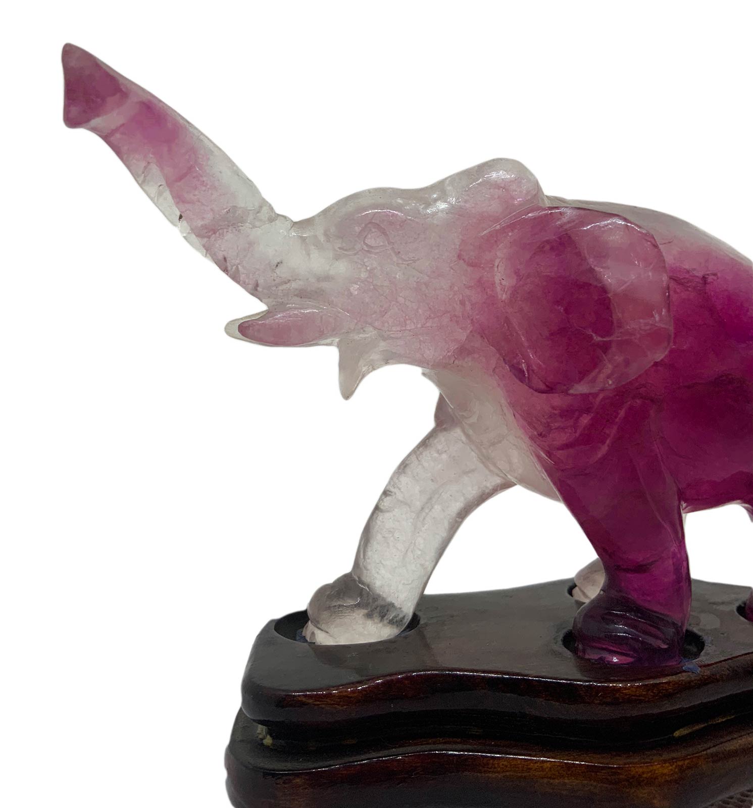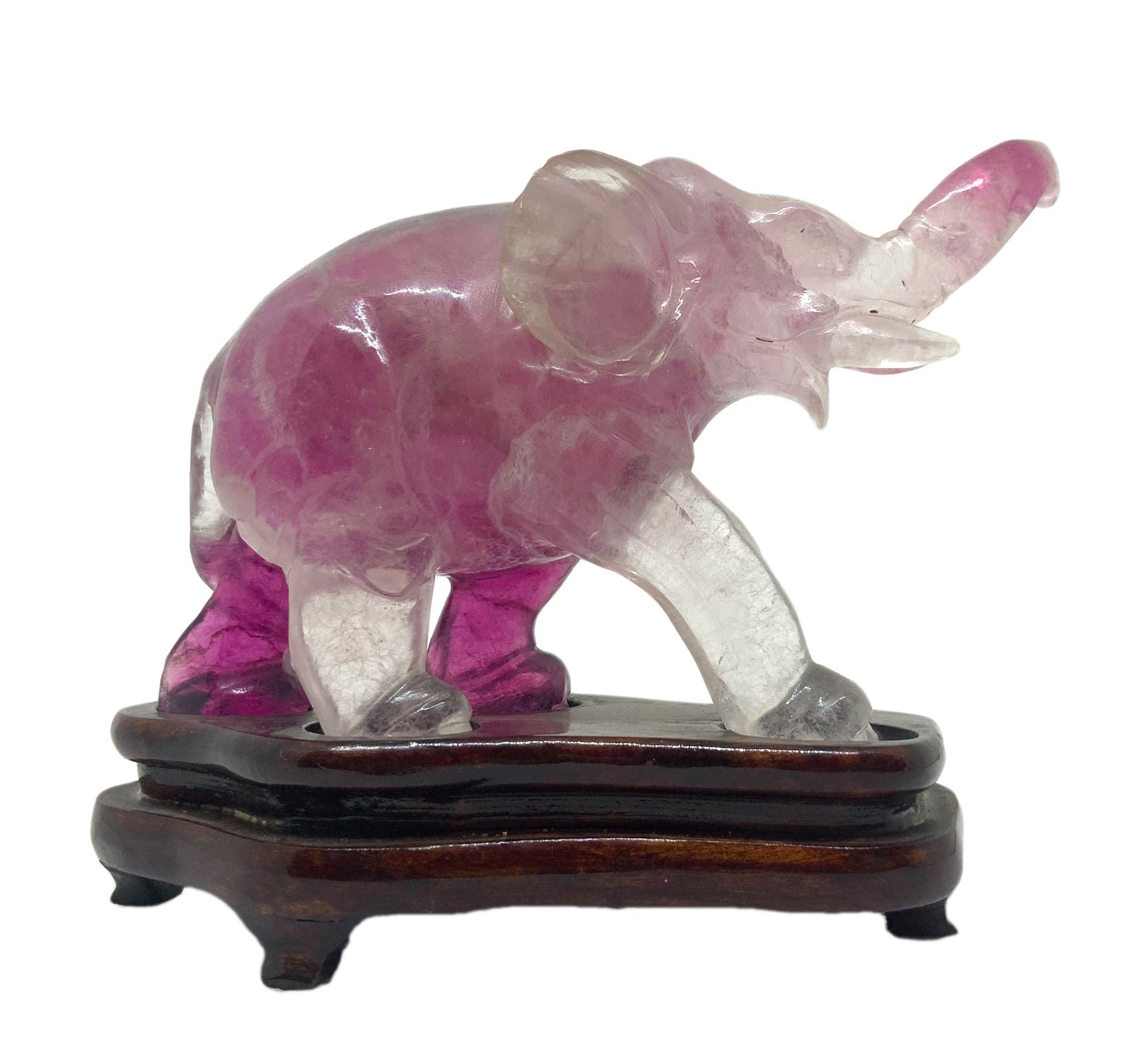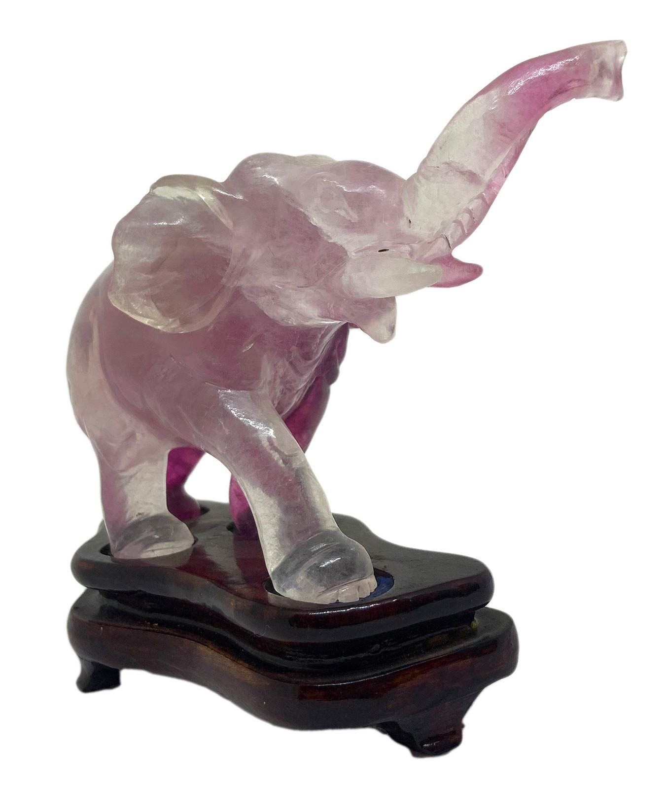 Statuetta cinese in ametista trasparente raffigurante elefante andante. Provenienza Pechino. Primi anni del ‘900. H cm 7. H con base cm 9. Lunghezza cm 11.