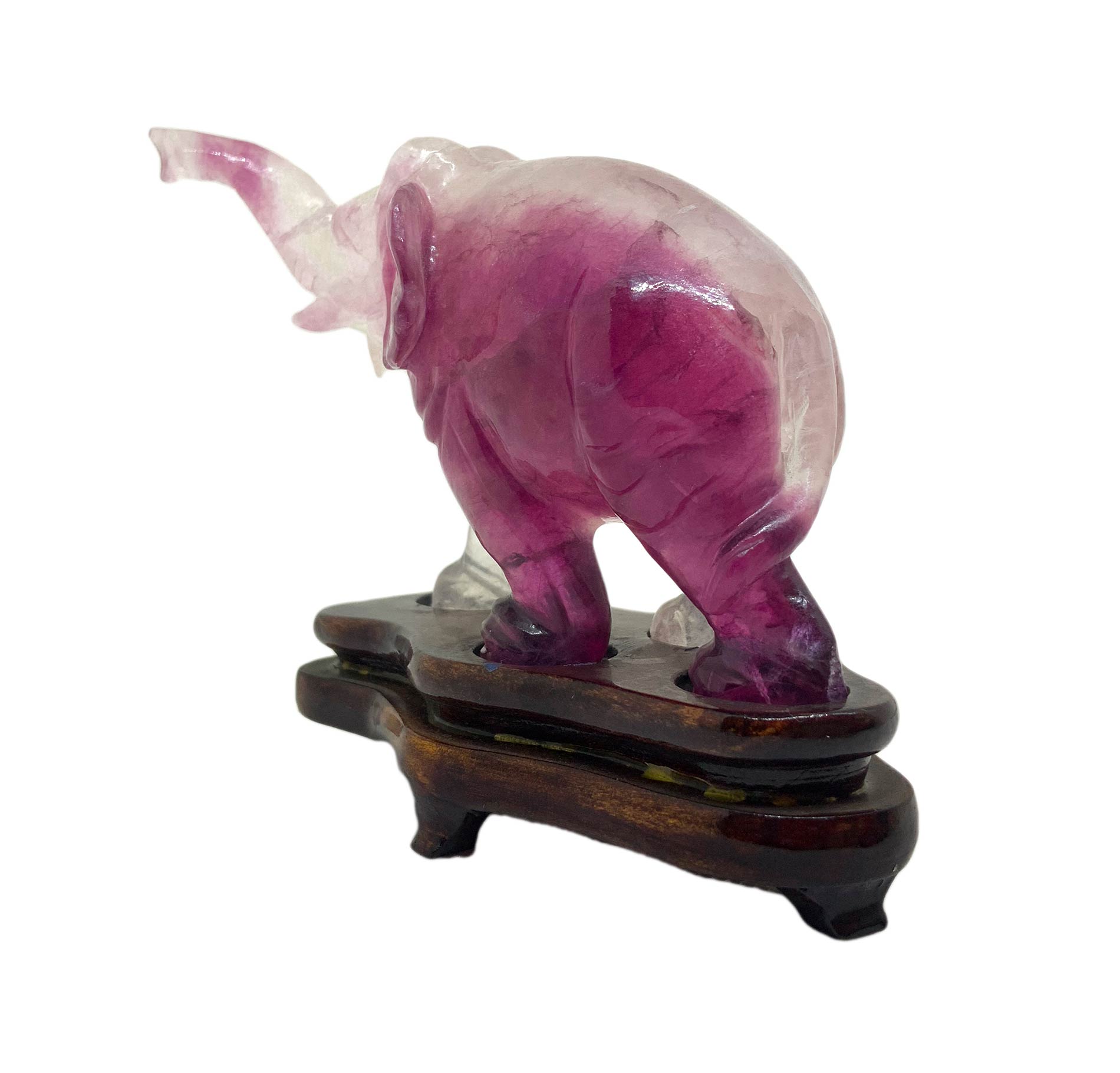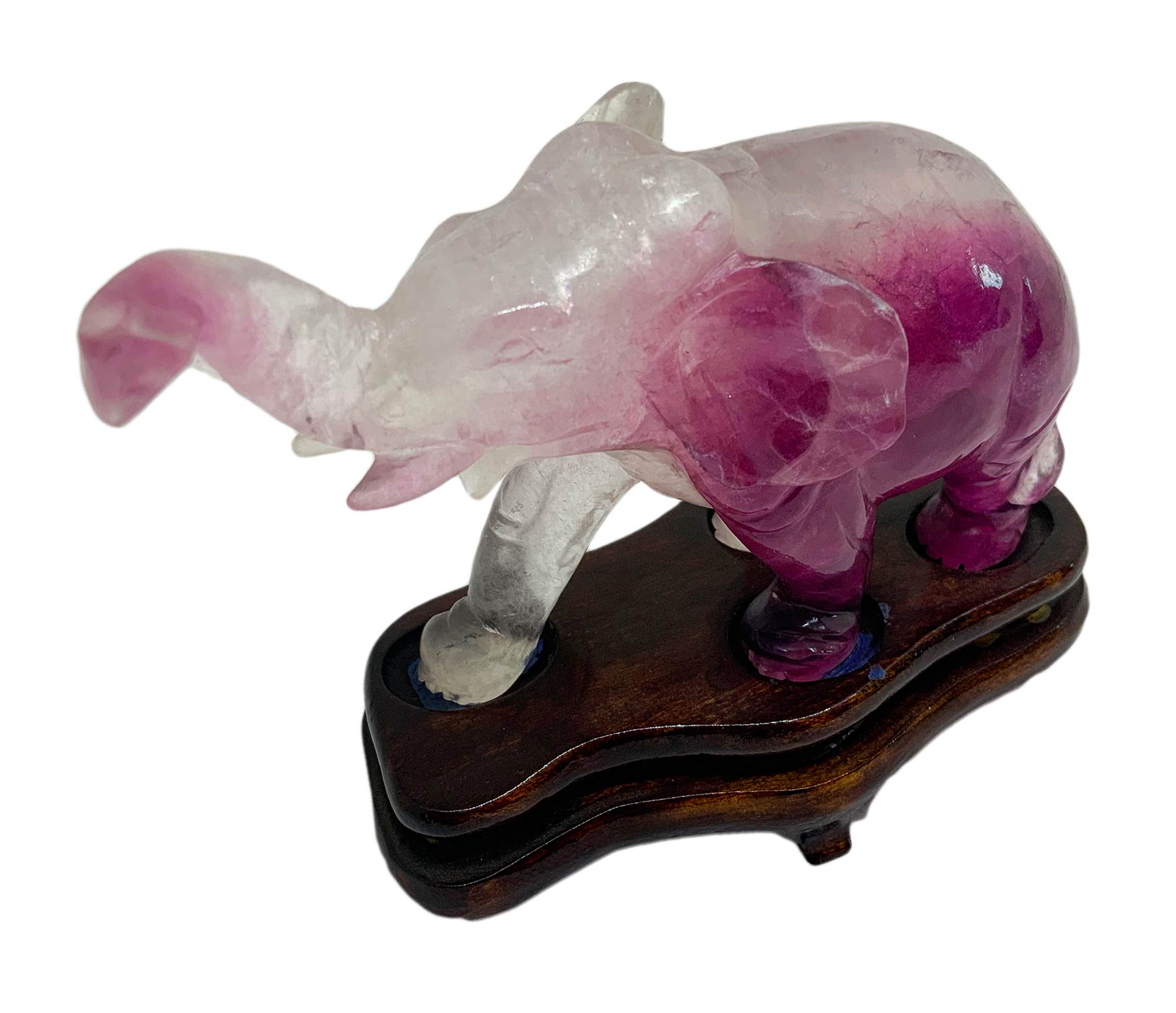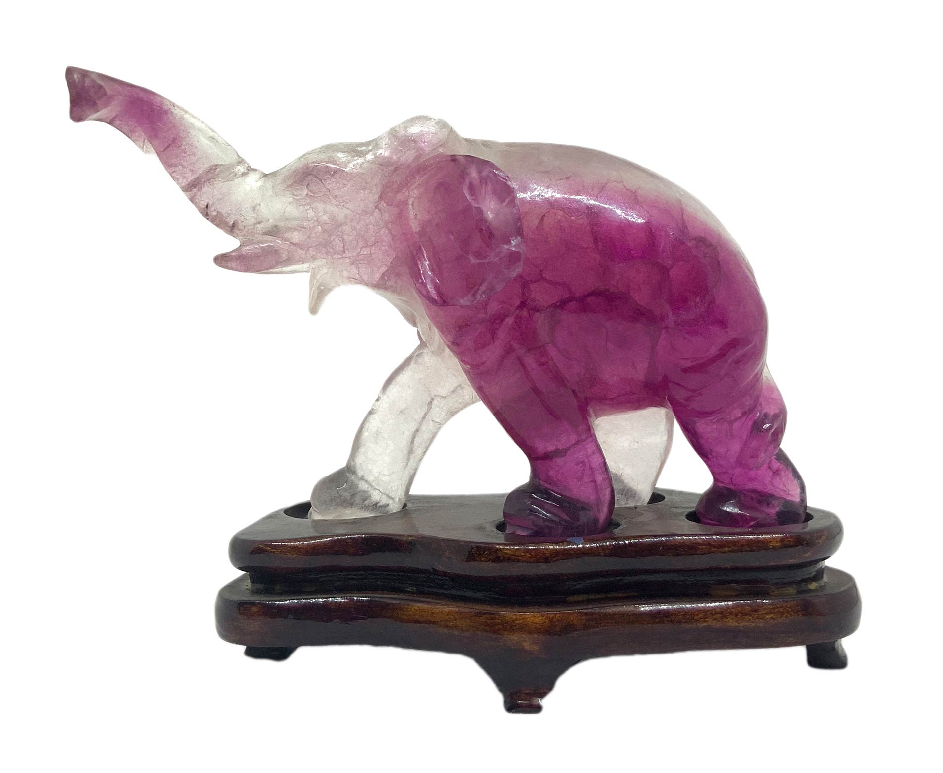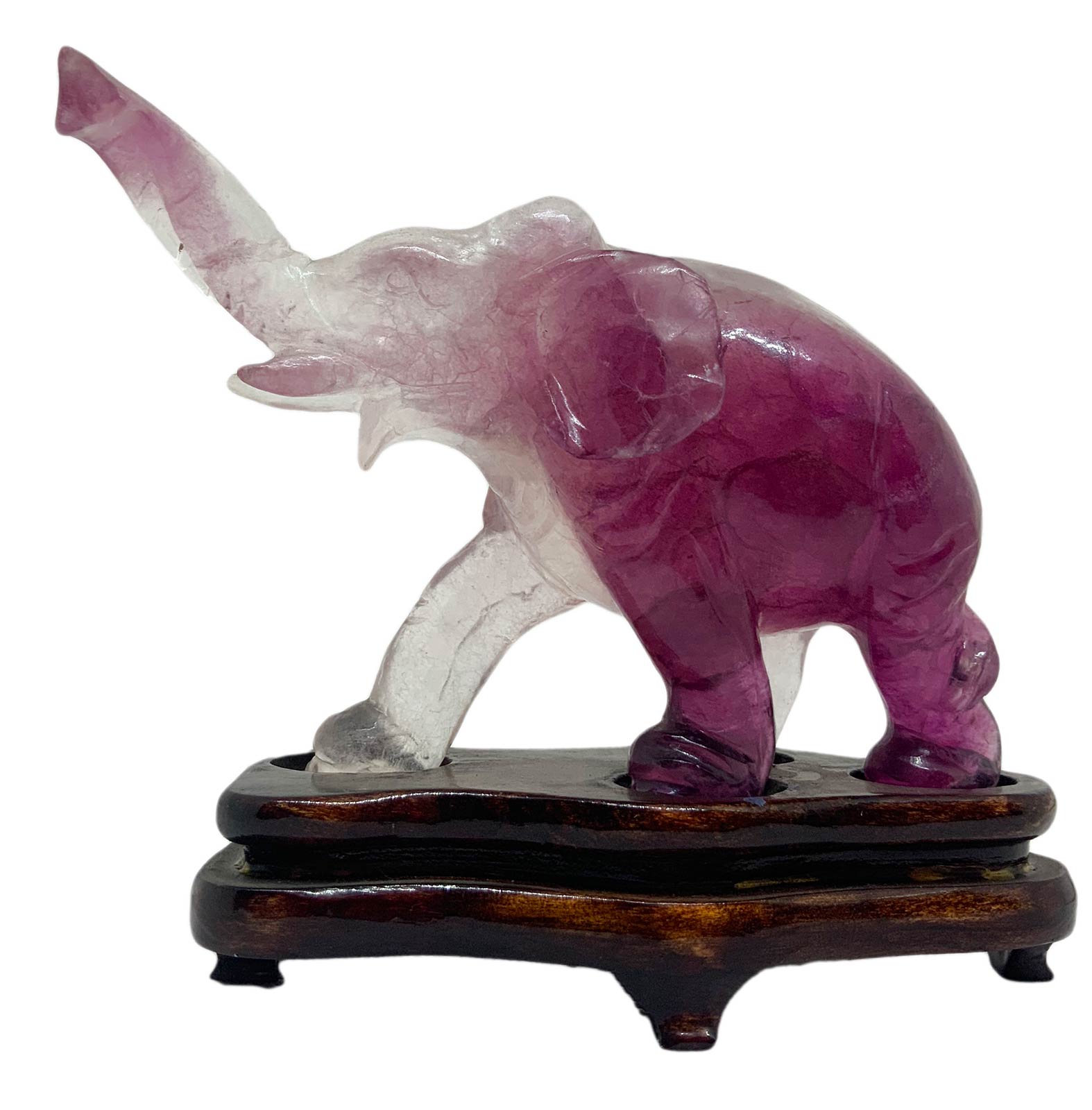 Statuetta cinese in ametista trasparente raffigurante elefante andante. Provenienza Pechino. Primi anni del ‘900. H cm 7. H con base cm 9. Lunghezza cm 11.