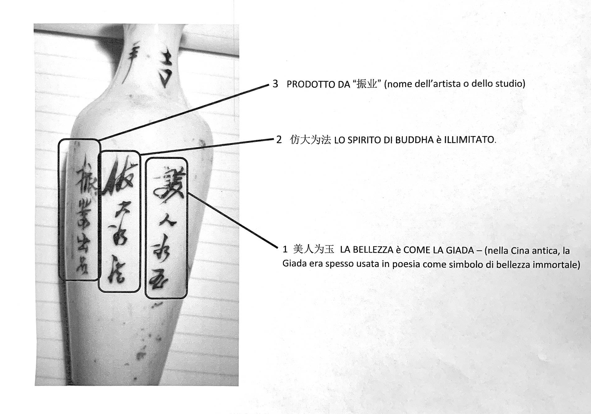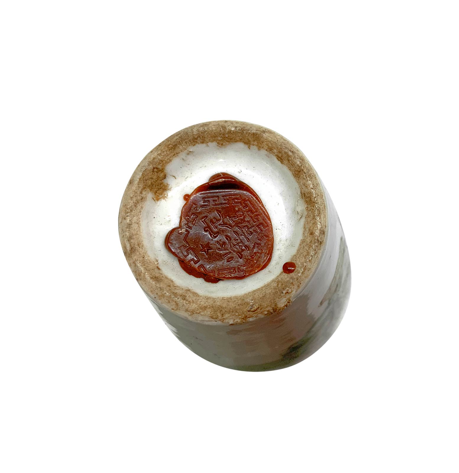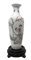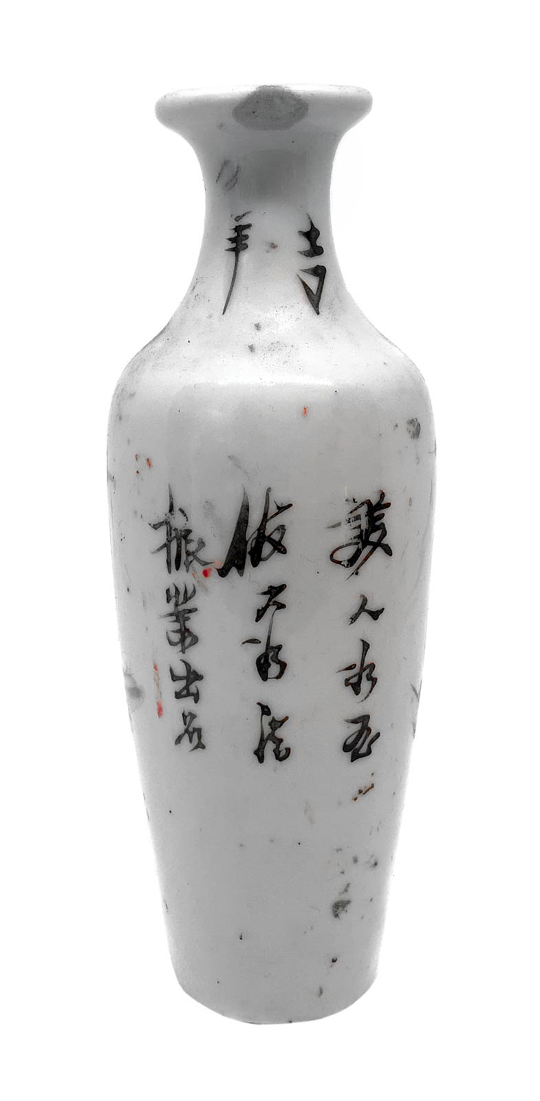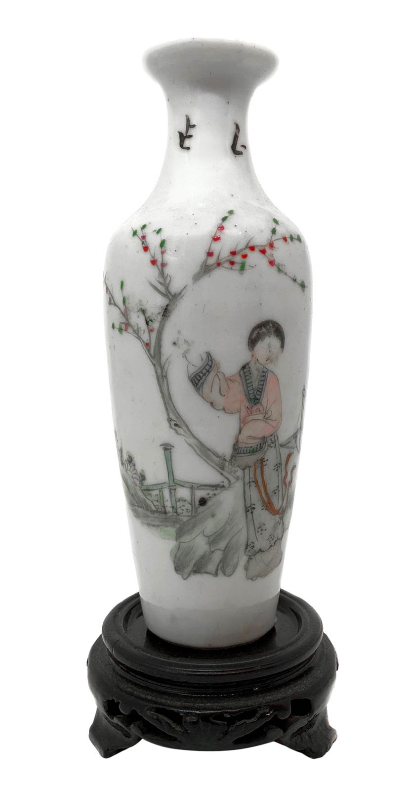 Vasetto di porcellana cinese dinastia Qing (1650-1750), recante da un lato tre antiche scritture: la prima a sinistra : il nome dell'artista ; la seconda centrale: lo spirito di Buddha è illimitato; la terza a destra : la bellezza è come la giada, dall'altro lato viene illustrata una geisha vicina ad un albero fiorito. Sigillo in ceralacca alla base. H cm 13. Con base H cm 15. Piccola sbeccatura al collo.