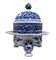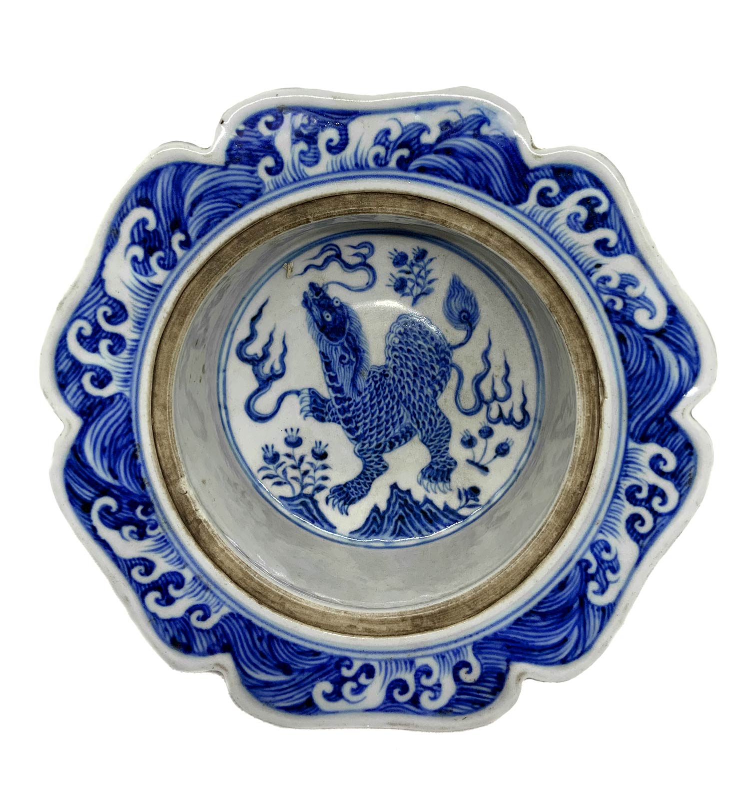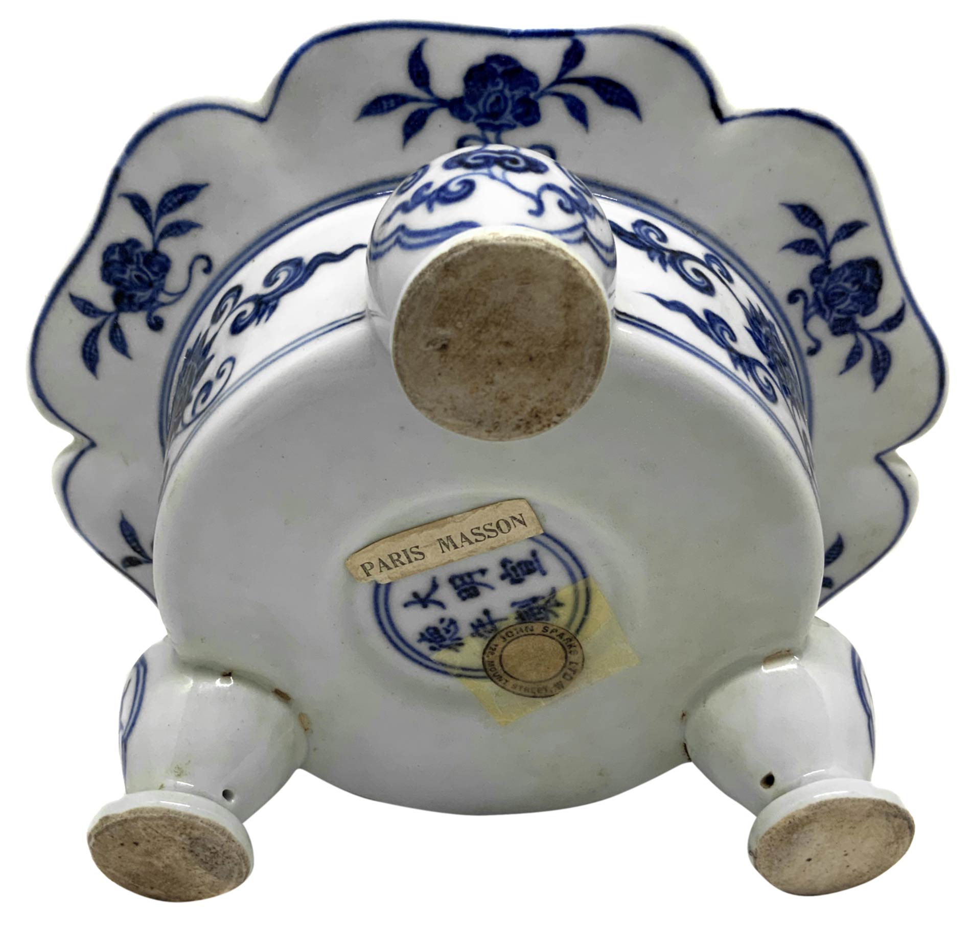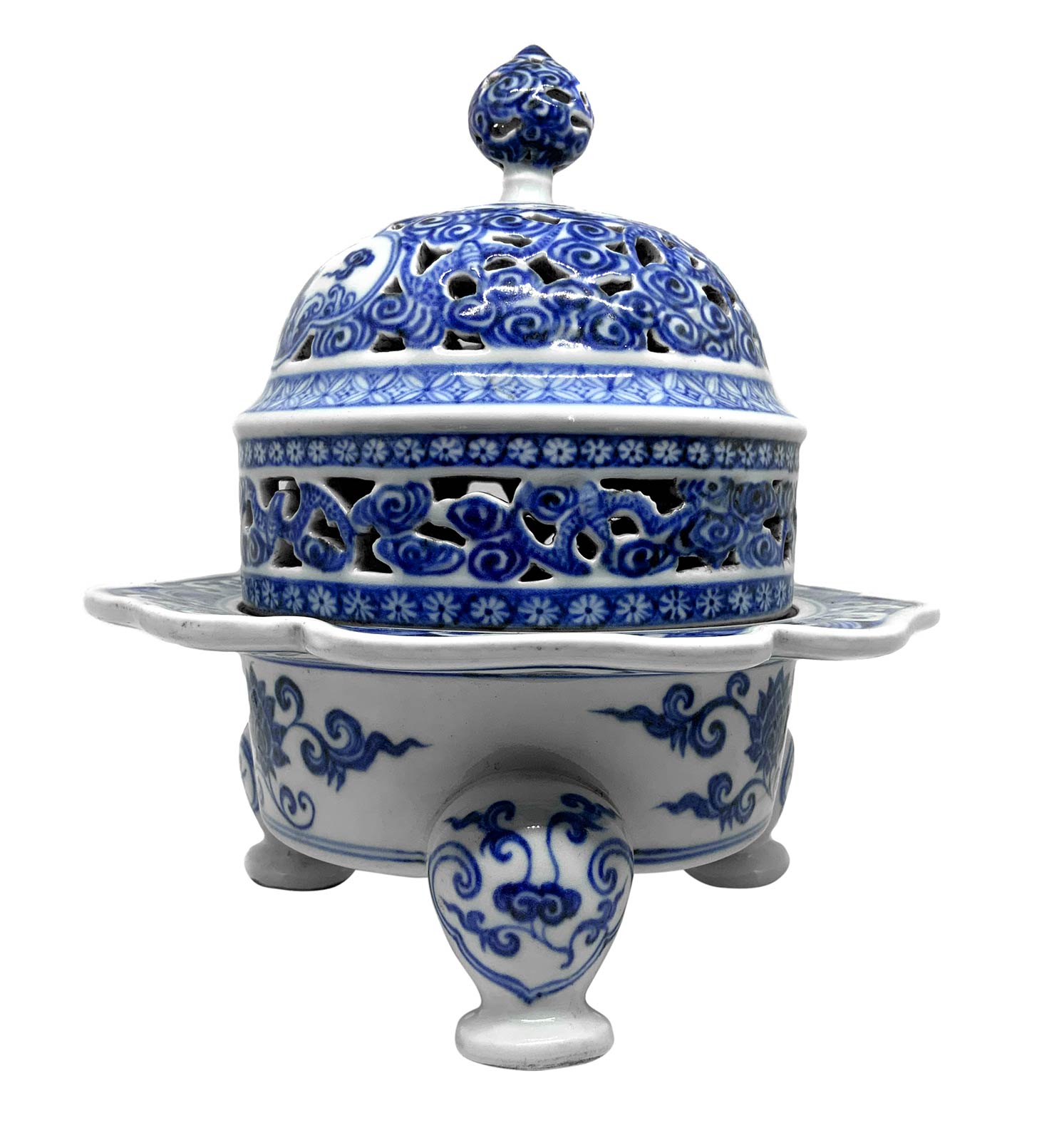 Incensiere tripode in porcellana bianca e blu, Cina XIX-XX secolo, la base decorata con motivi floreali, il coperchio finemente lavorato al traforo con motivi di spirali, l’interno dell’incensiere abbellito con un animale fantastico, reca sulla base marchio apocrifo Ming Xuande ed etichette di antiquari. H cm 24. Diametro cm 21.