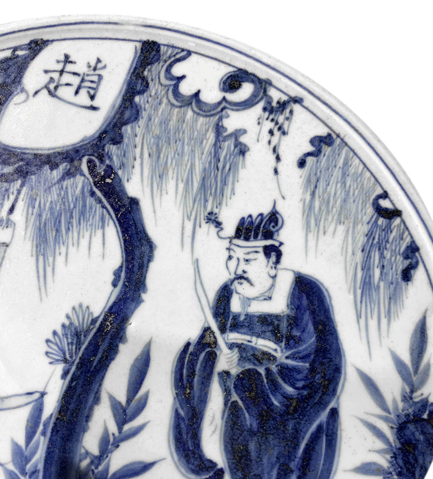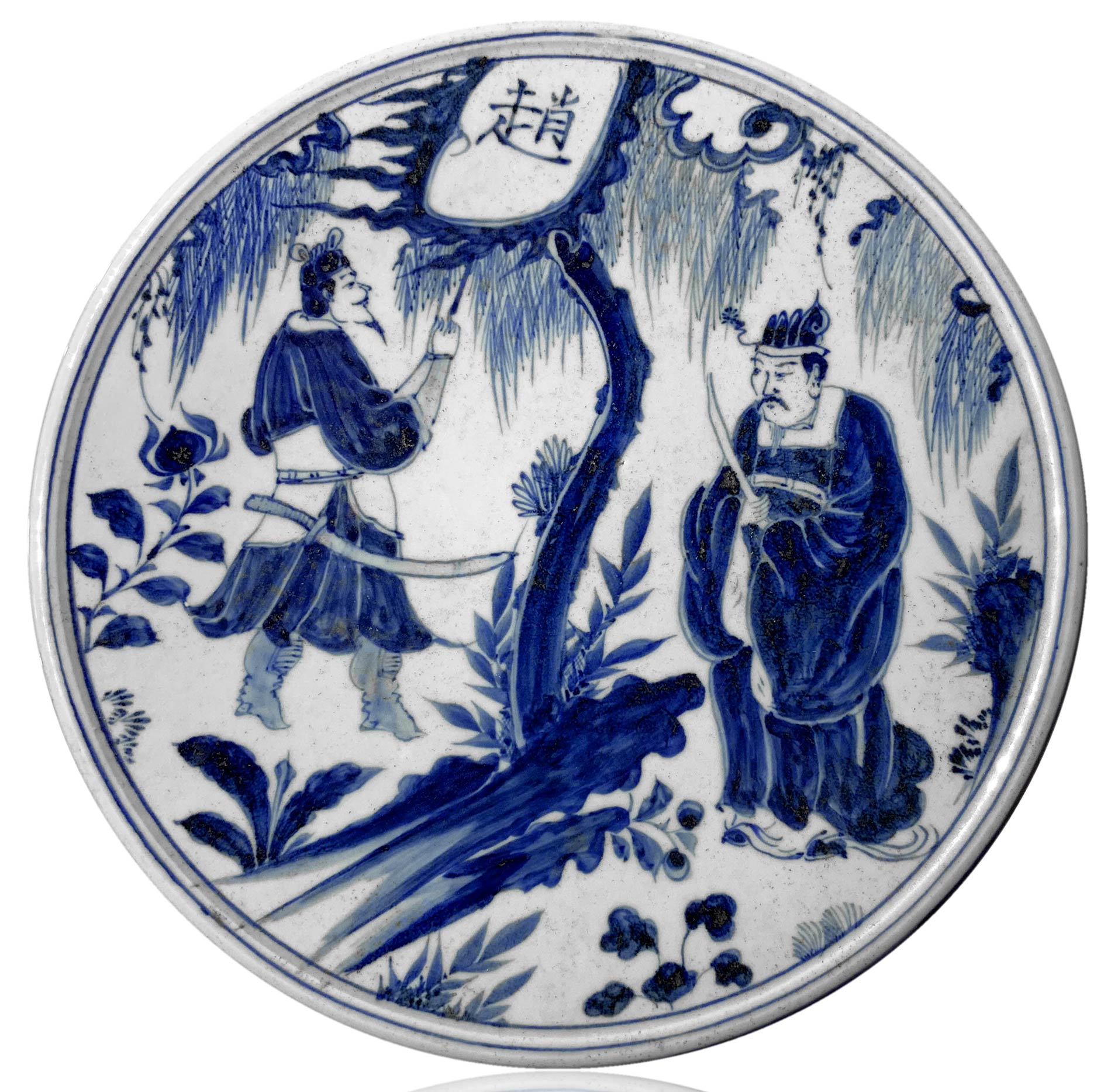 Placca cinese in porcellana circolare decorata nei colori del bianco e blu,...