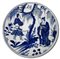 Placca cinese in porcellana circolare decorata nei colori del bianco e blu, con personaggi di epoca Song e nome dell’Autore. Cina, XX secolo. Cm 27,5 x 2.