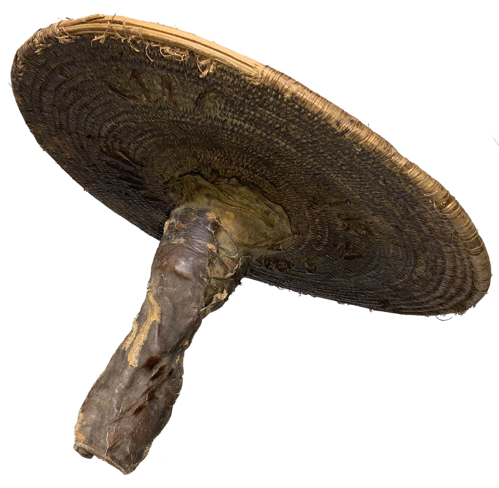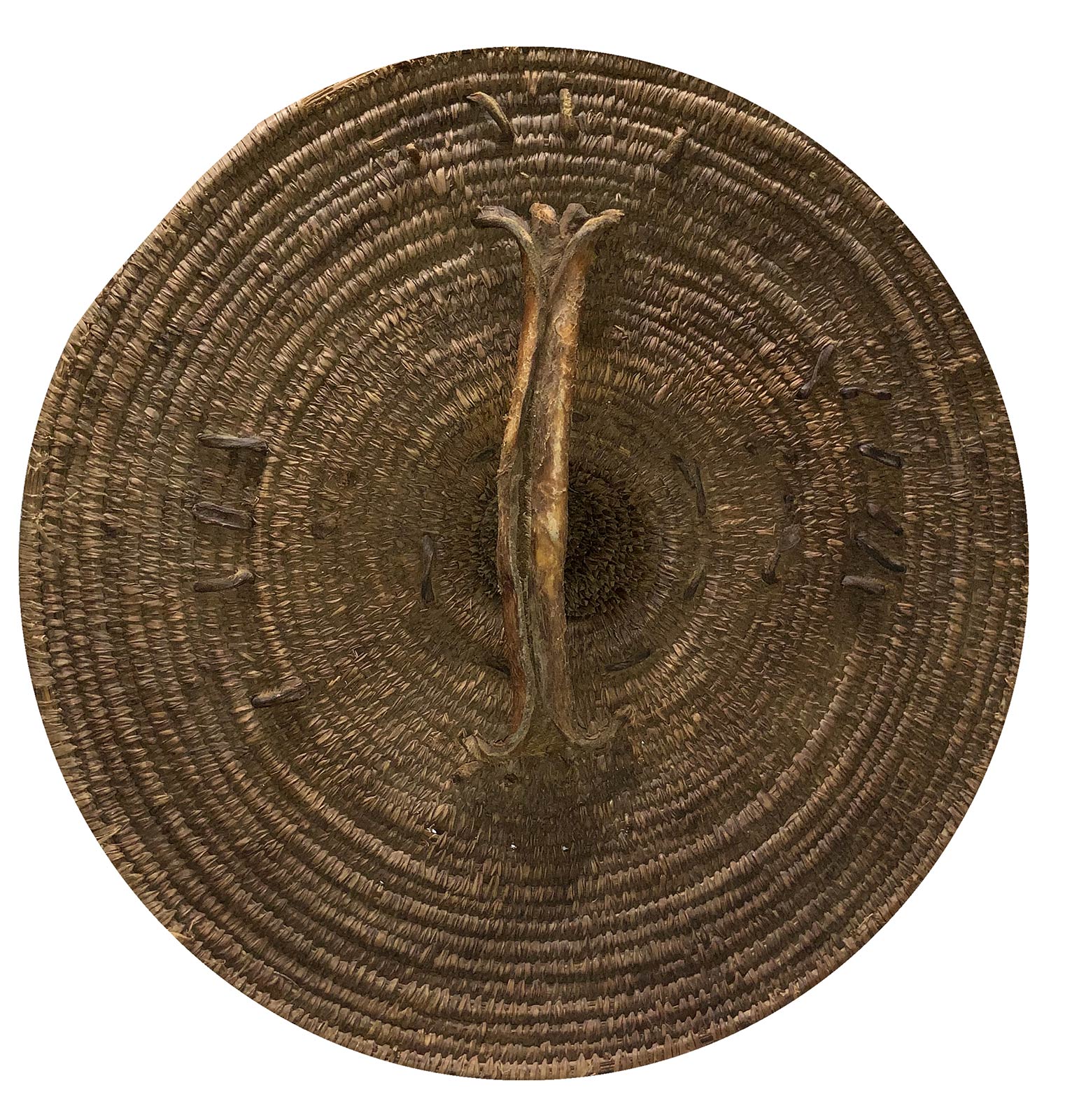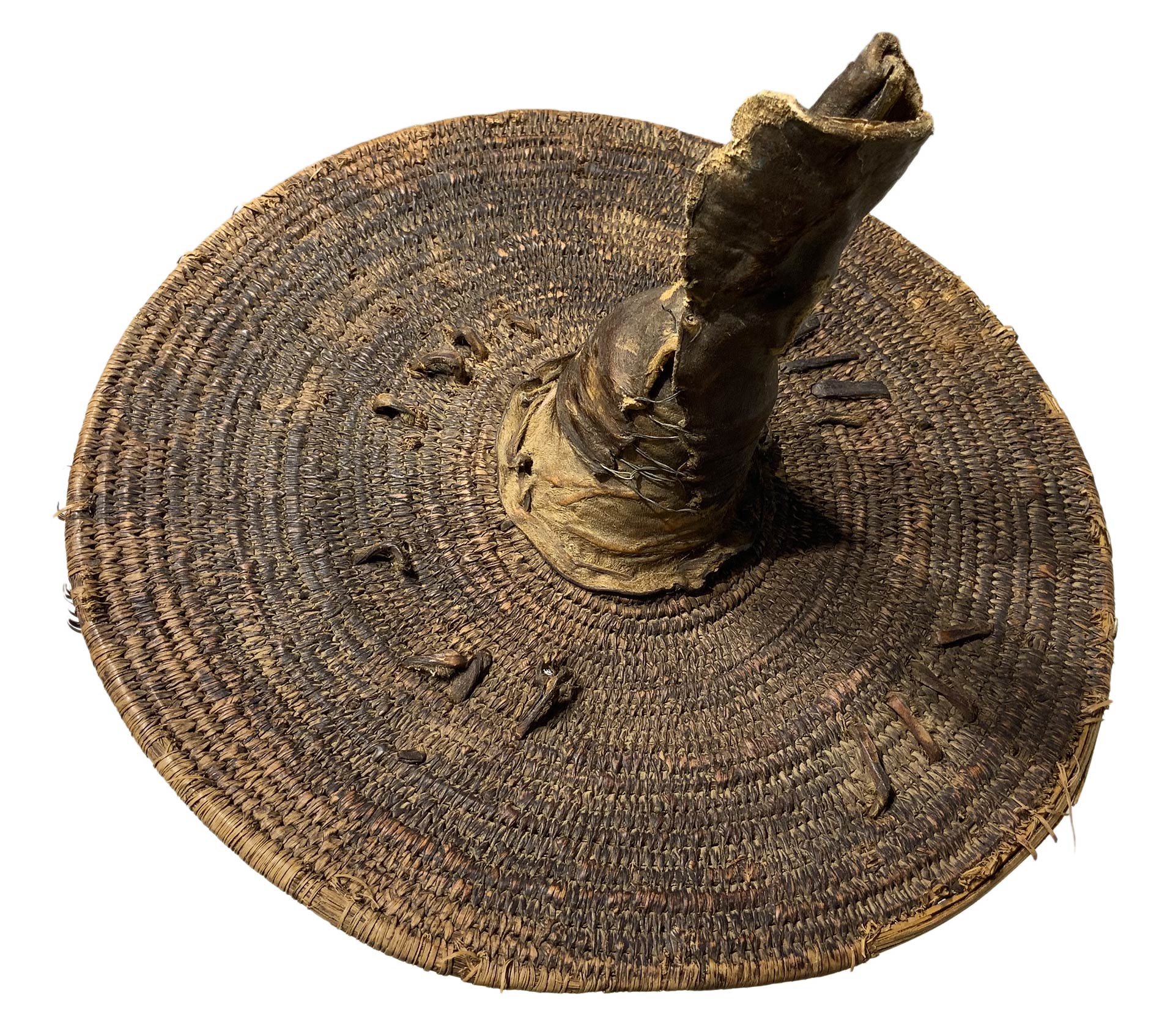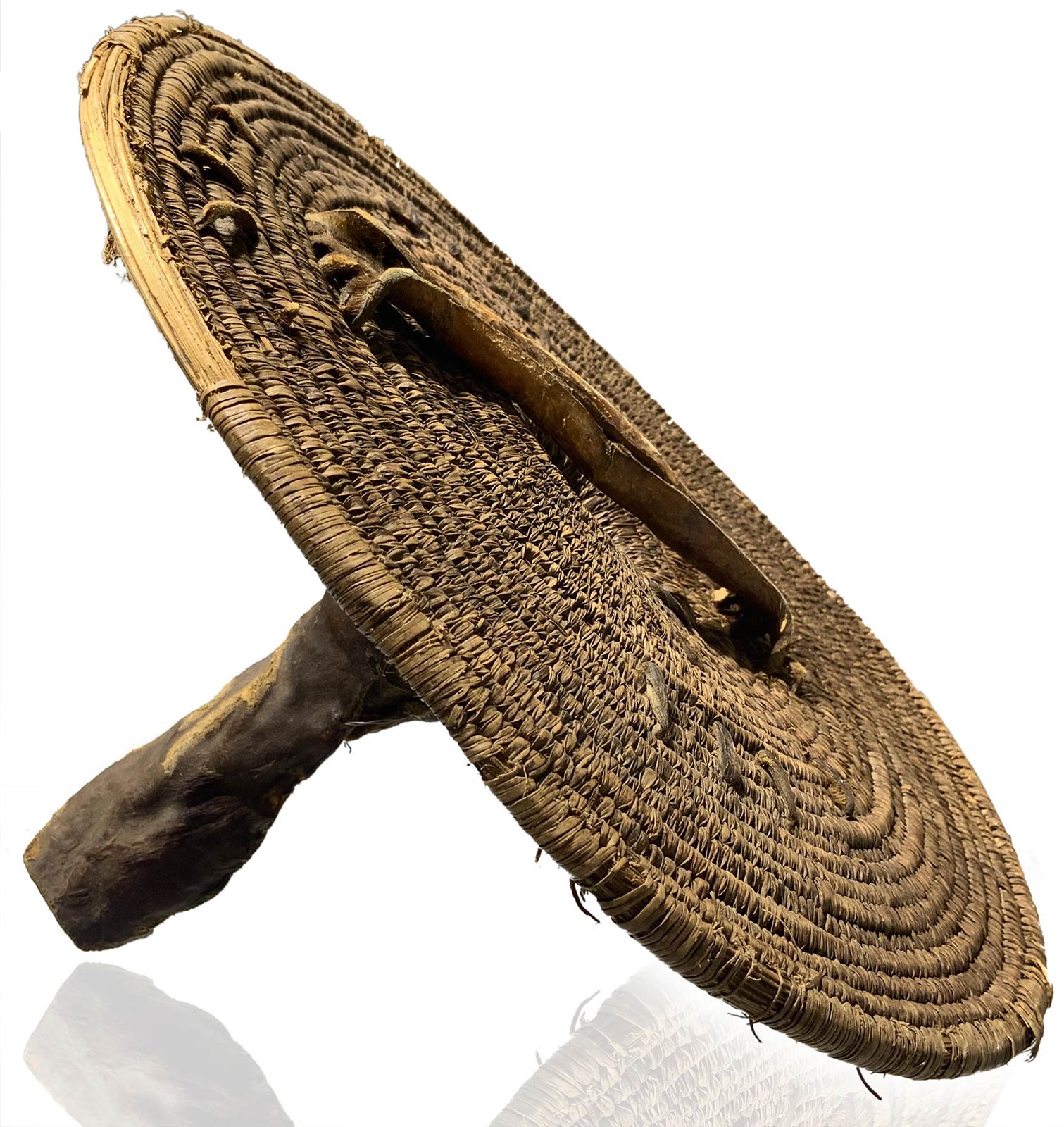 Scudo in raffia intrecciata con strisce di pelle per adolescente touareg, Niger, XIX/XX secolo. Cm 28x15.